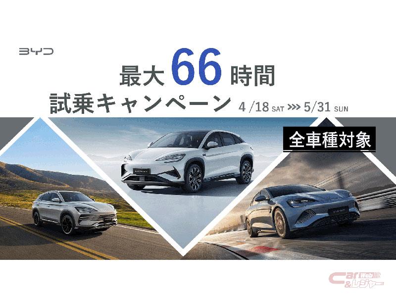 BYDオートジャパンは、EVおよびPHEVを日常生活の中で体験できる「最大66時間 BYD試乗キャンペーン」を、4月18日から5月31日まで全国のBYD正規ディーラーにおいて実施している。