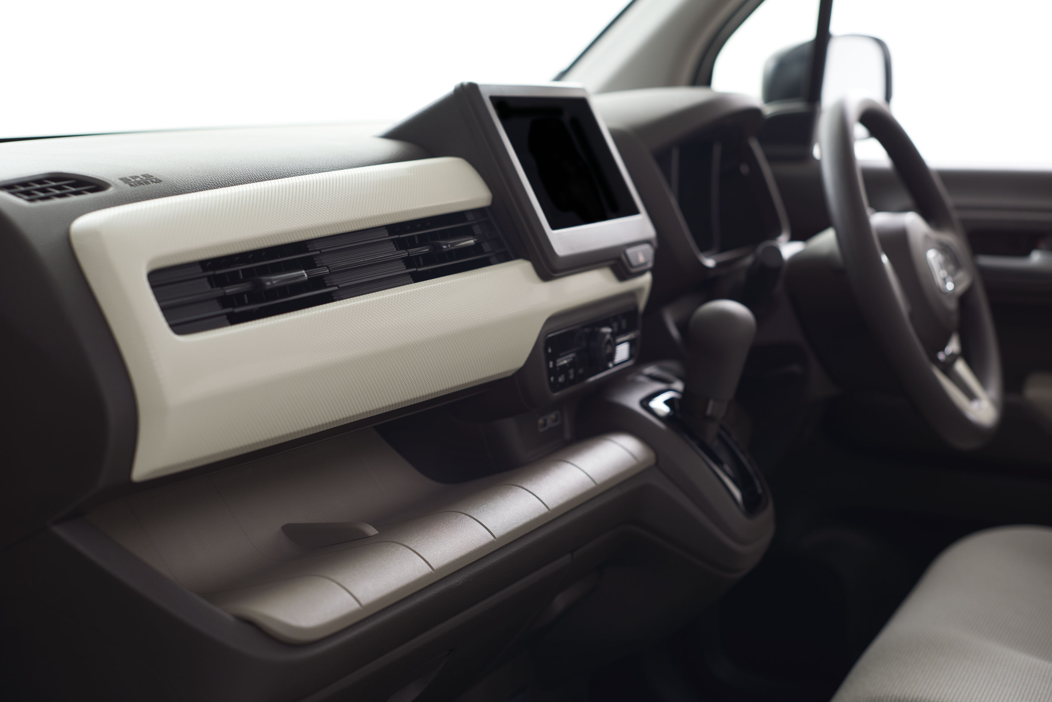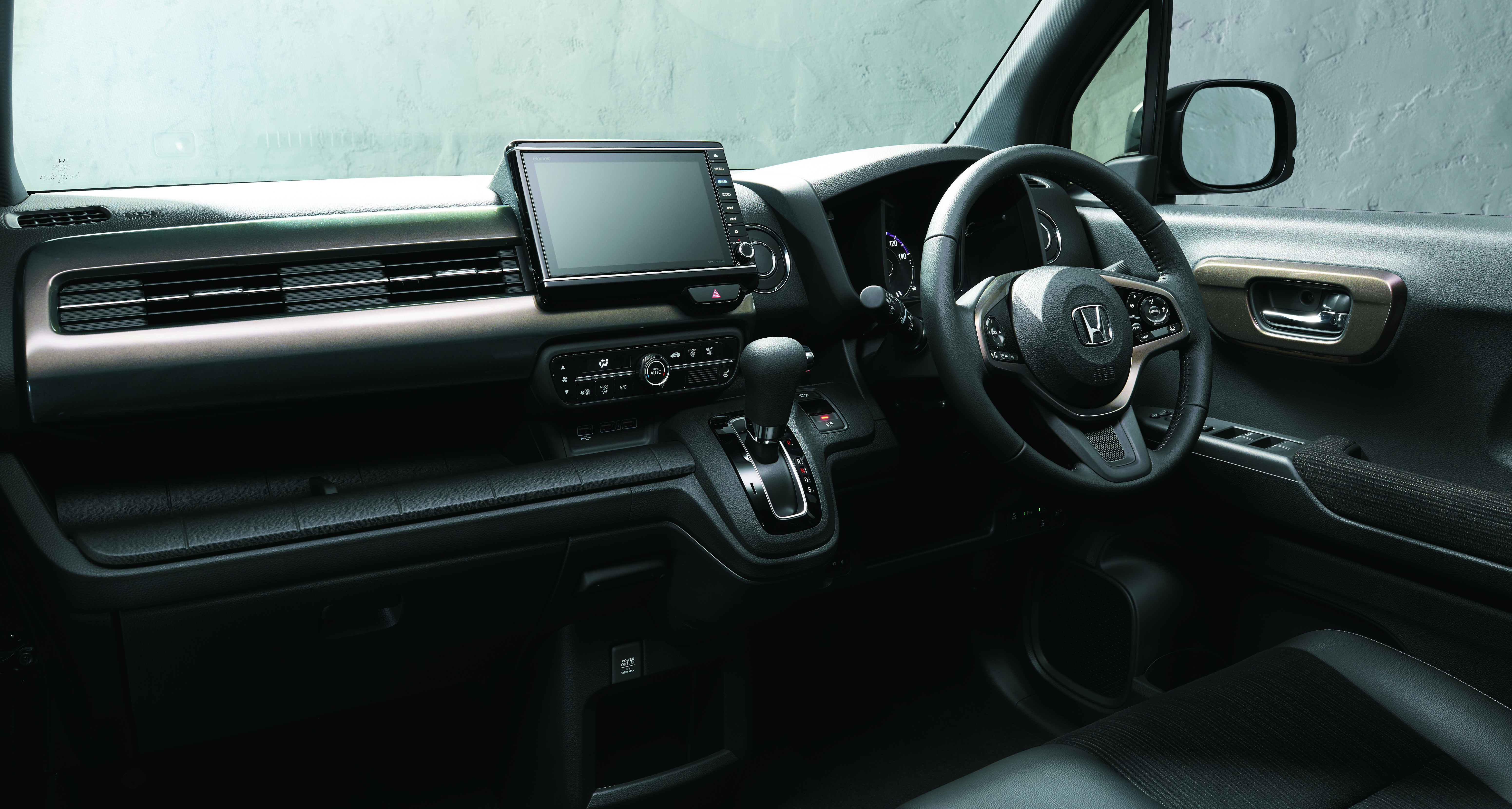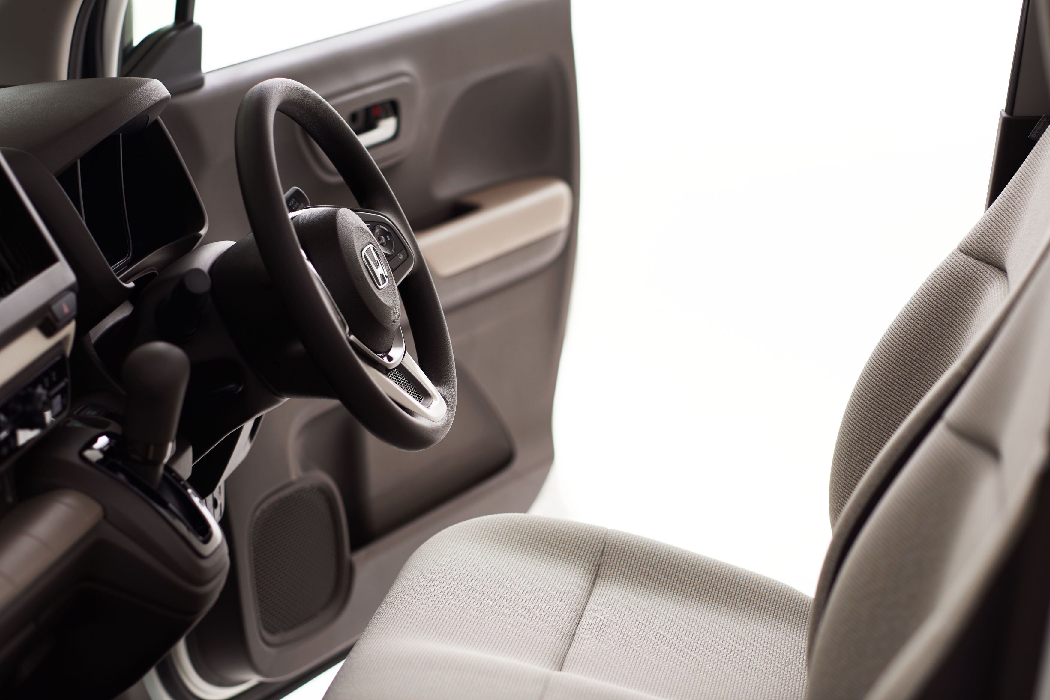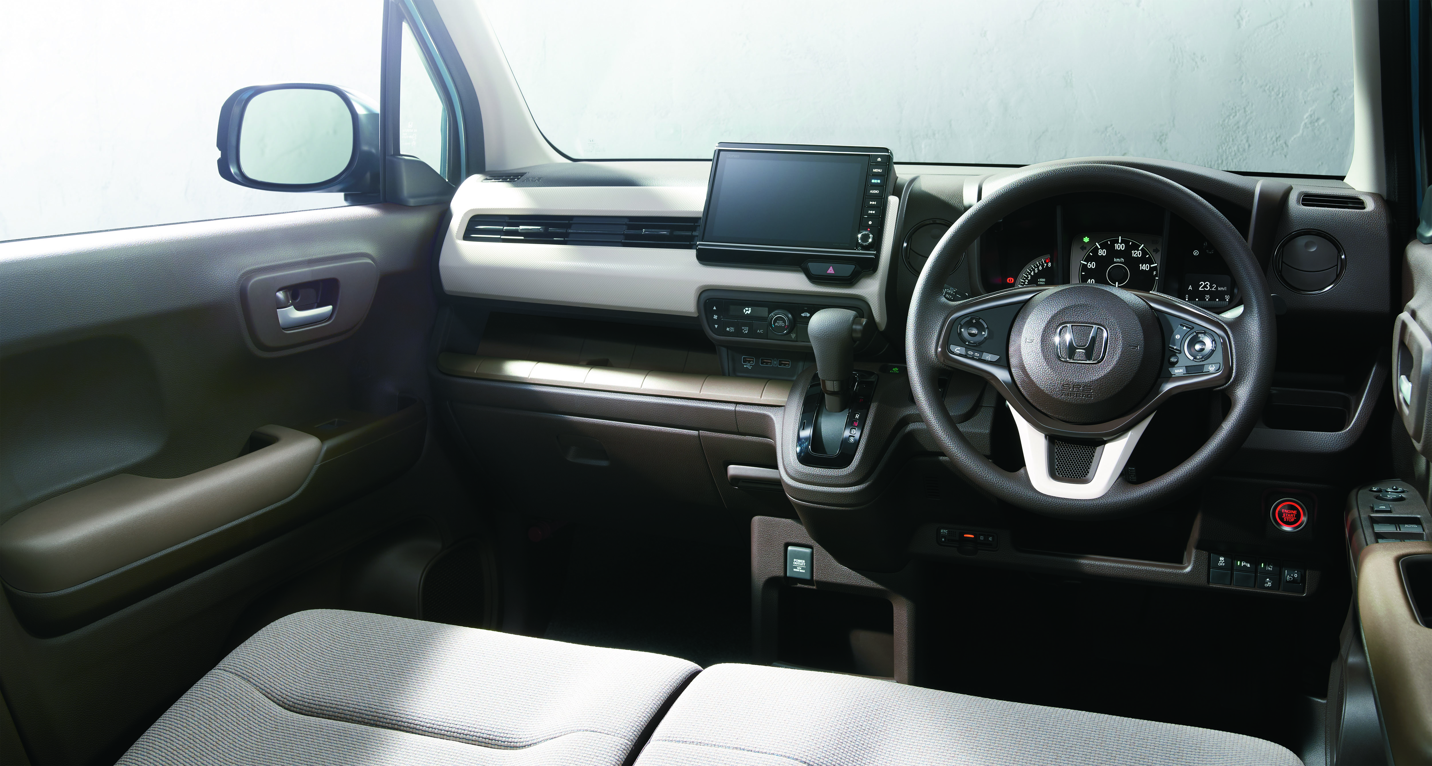 N-WGNのエクステリアは、フロントからリヤゲートまでハリのあるおおらかな面で構成し、ヘッドライトの形状と合わせて親しみやすさを表現。インテリアはブラウンを基調とし、毎日を心地よく過ごせる落ち着いた空間に仕立てられている。
