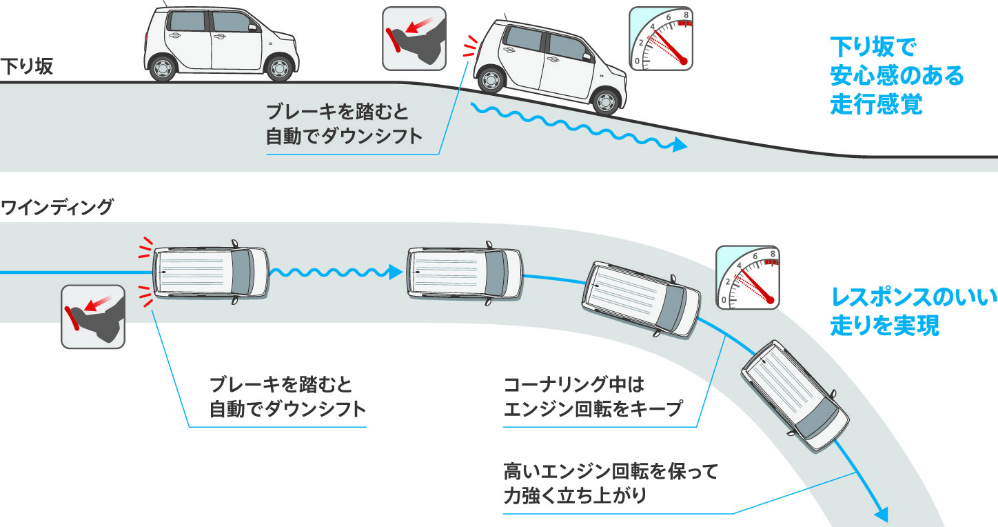 トランスミッションは全車CVTとなり、パドルシフトやブレーキ操作を行うことなく、通常のブレーキ操作だけで自動的にシフトダウンし、エンジンブレーキを併用したスムーズな減速が行える制御を採用。走行状況に応じたダウンシフトも行い、なめらかな運転を可能としている。
