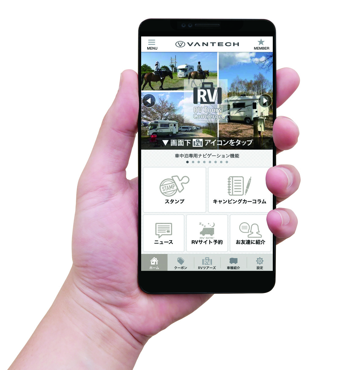 バンテックでは、スマートフォンやタブレットで使えるオリジナルアプリを配信中。このアプリは、キャンピングカー関連の最新情報をはじめ、全国で開催されるキャンピングカーイベント情報の他、アプリユーザーだけに特別価格で提供するキャンピングカーパーツのセール情報も随時配信しており、バンテックユーザーだけでなく、キャンパー必見の内容となっている。