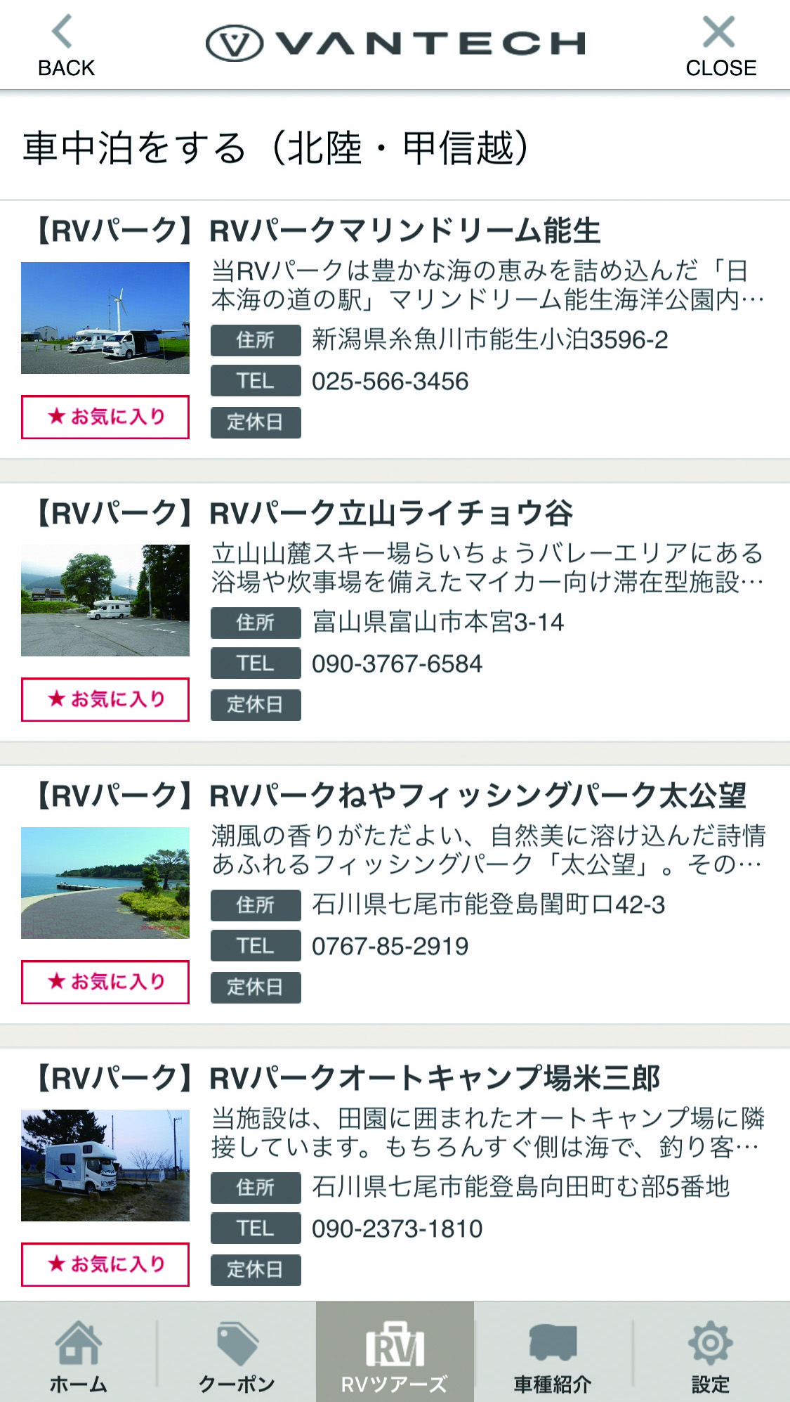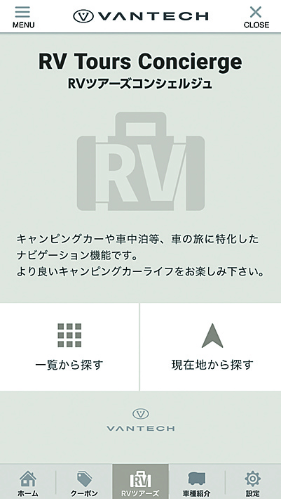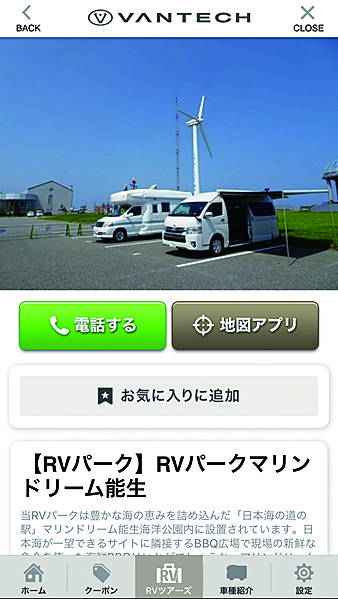 さらに、先日新機能として、RVパークや道の駅を一覧や現在地から検索でき、目的地までのナビゲーションも行う「RVツアーズコンシェルジュ」を実装。スマートフォンのGPS機能を使い、現在地から一番近い車中泊拠点を検索することも可能な優れもの。バンテックがプロデュースする鴨川RVサイトの予約もこのアプリで可能で、サイトに空きがあれば、最短で1時間前までの予約で利用ができるので、思い立った時にすぐに使える便利さが大きな魅力となっている。
