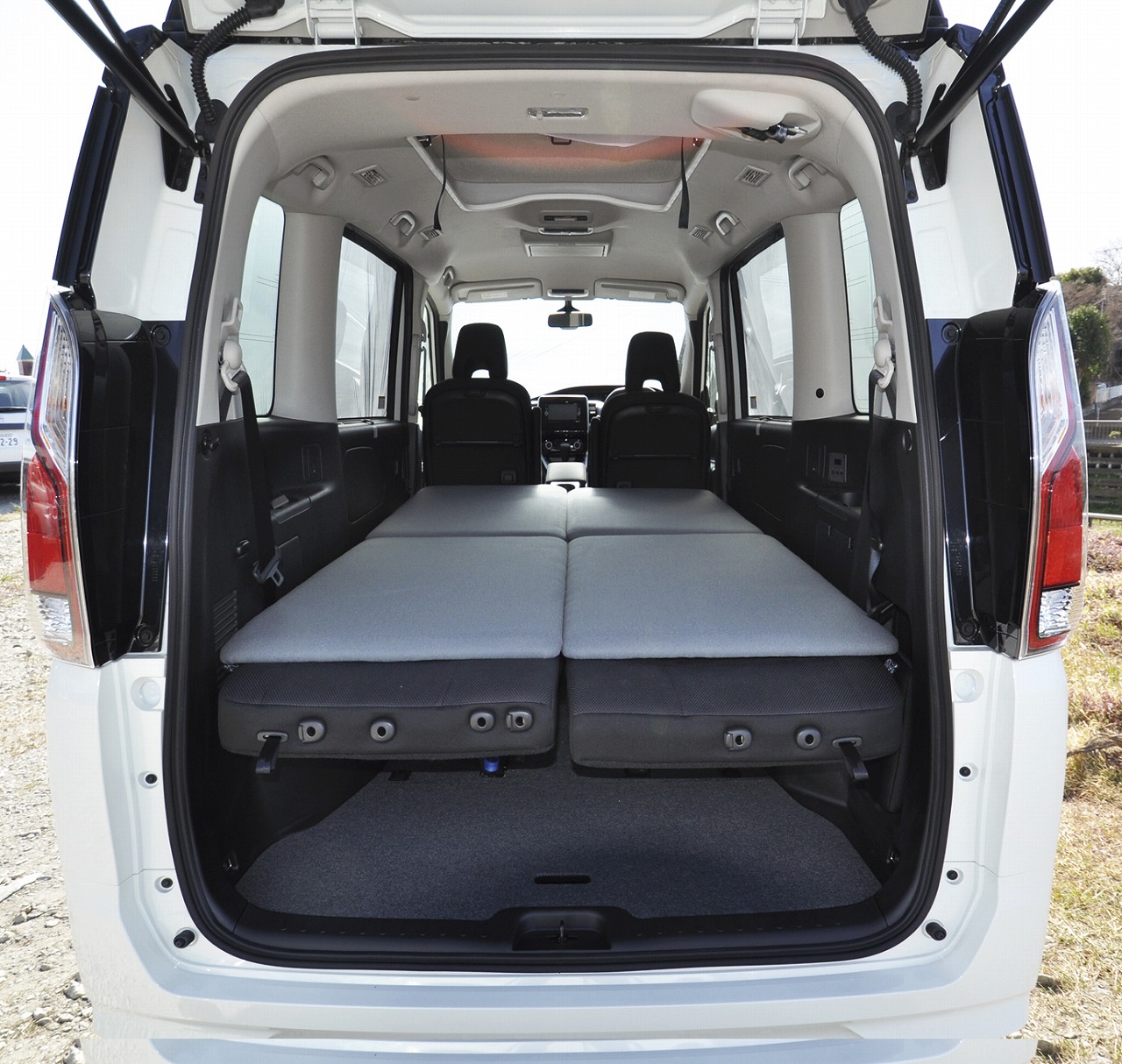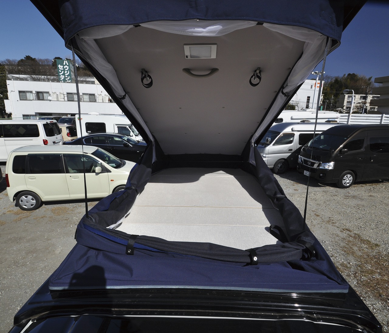 そのポップアップルーフはガスダンパーを装着し、女性でも簡単に展開できることも嬉しいポイント。風通しの良いハーフオープン、開放的なフルオープン、状況に応じた開閉が可能でフルオープン時の内部クリアランスは最大で1040㎜。セカンドシートとサードシートを倒し、専用のベッドマットを設置すればフラットで快適な車中泊を実現する。