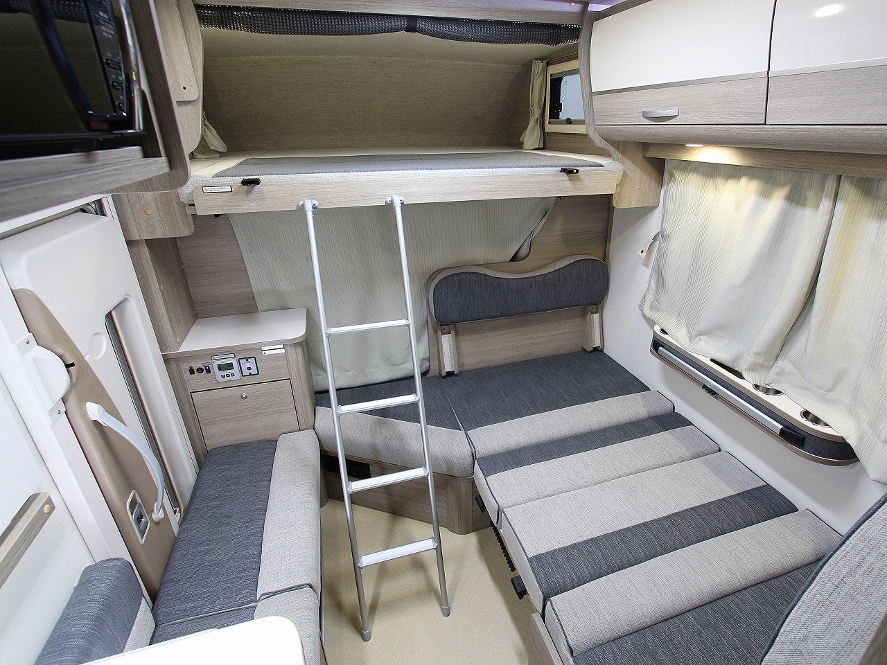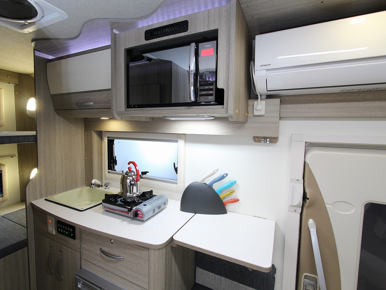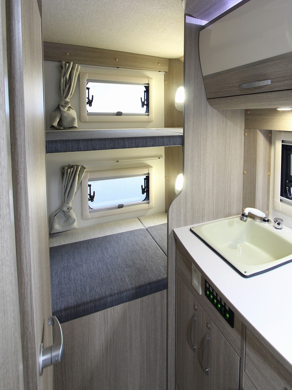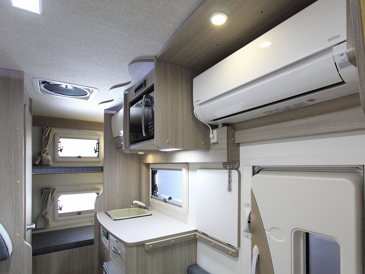 また、ポップアップルーフは、左右にメッシュタイプの窓を配置。換気はもちろん採光用の天窓としても利用でき、室内高は1800㎜以上を確保する。ポップアップルーフのベッドサイズは、長さ1800㎜×幅1020㎜。上下ベッドで4名まで就寝できる。