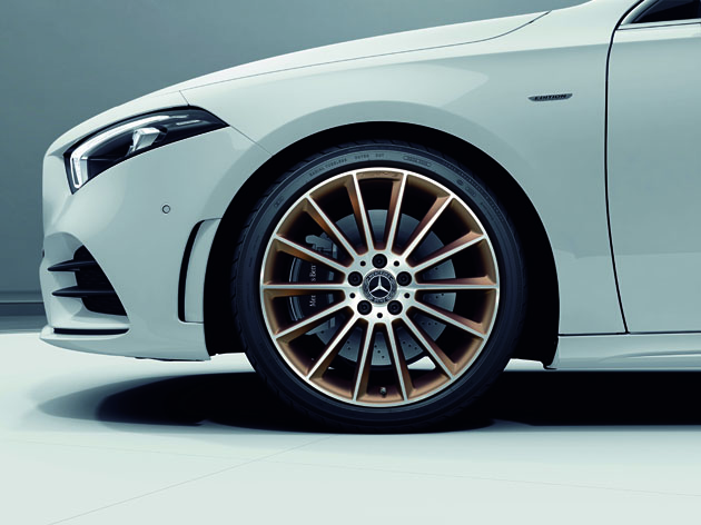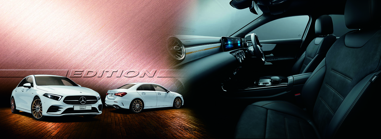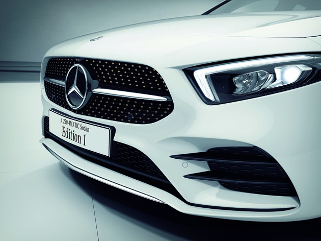 発表記念特別仕様車「A 250 4MATIC セダン Edition 1」は、外装色にポーラーホワイトを採用し、コッパーアクセント入りブラックダイヤモンドグリルや専用のコッパーアクセントの入った19インチAMGマルチスポークアルミホイール、フロントフェンダーには専用の「Edition」を示すバッジが装備され、スタイリッシュで上品なイメージを演出する。