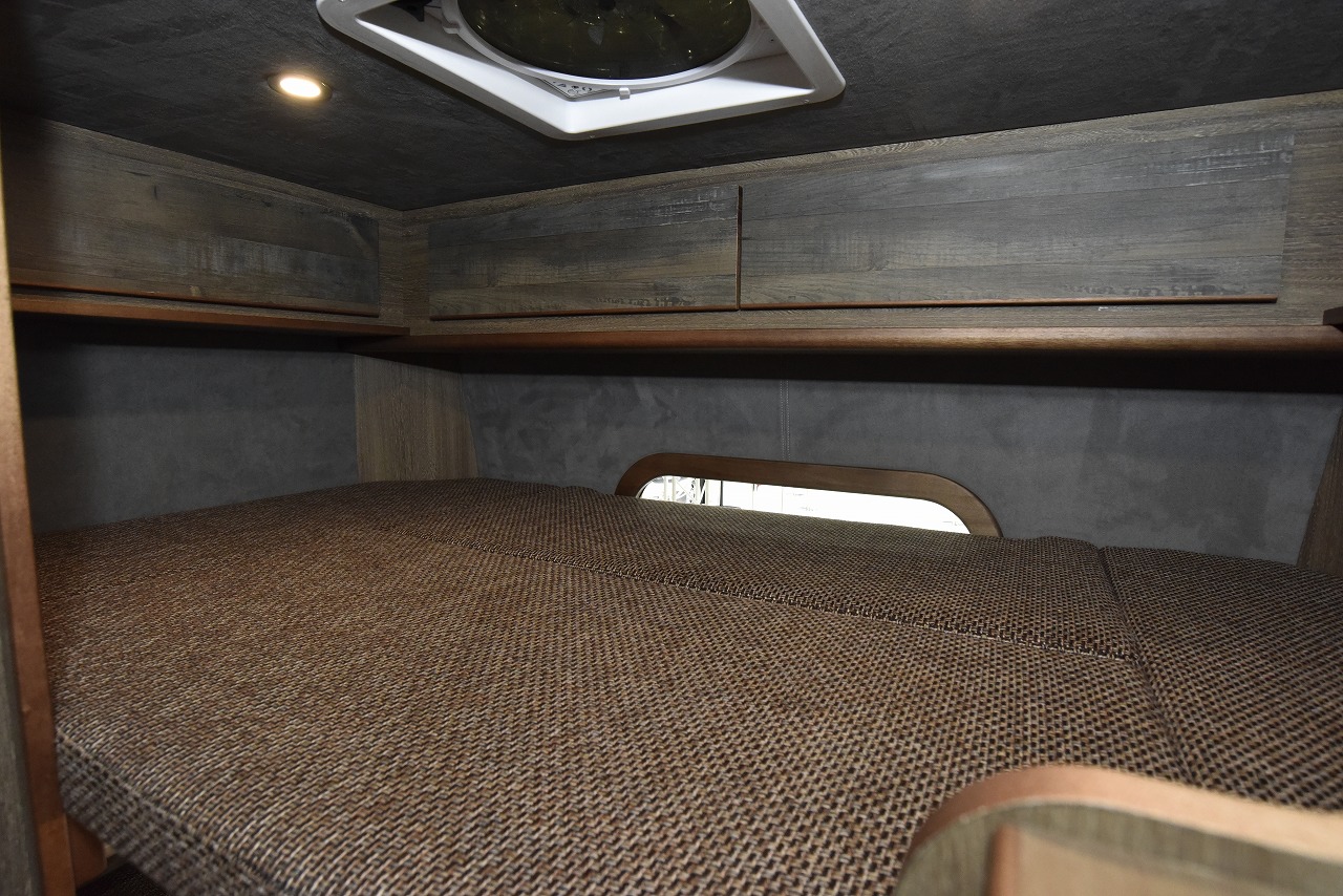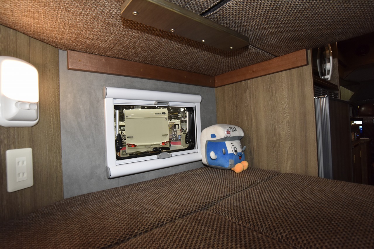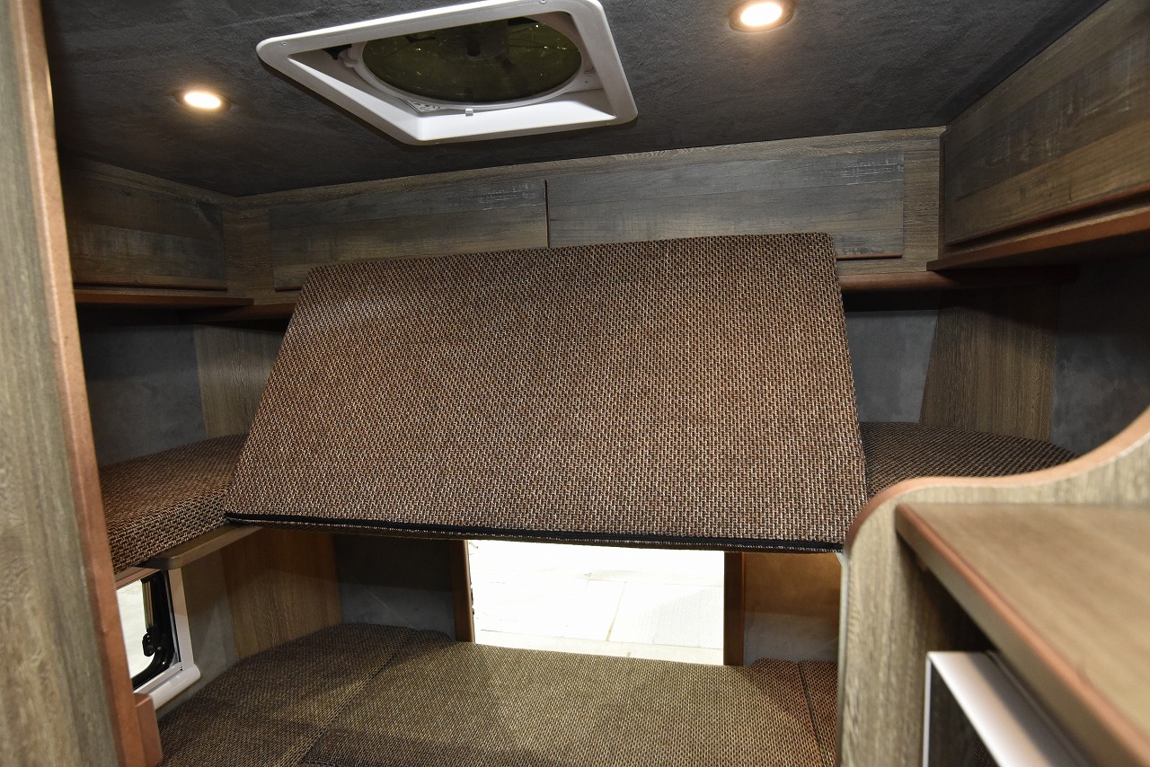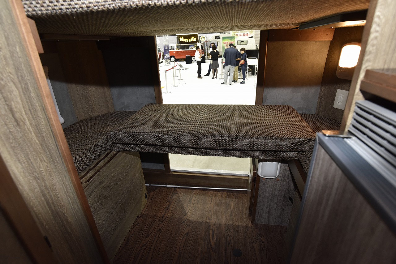 リヤの2段ベッドは、上下段とも1850mm×1050mmのスペースを実現。さらに、使わないときはマットを跳ね上げてカーゴスペースとして活用できるユーティリティ性も見逃せないポイントと言える。