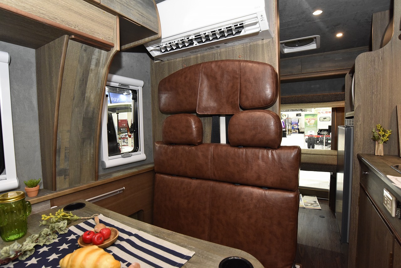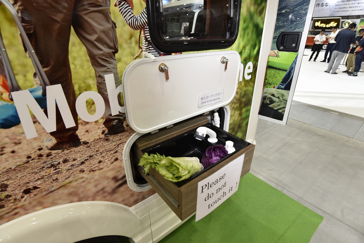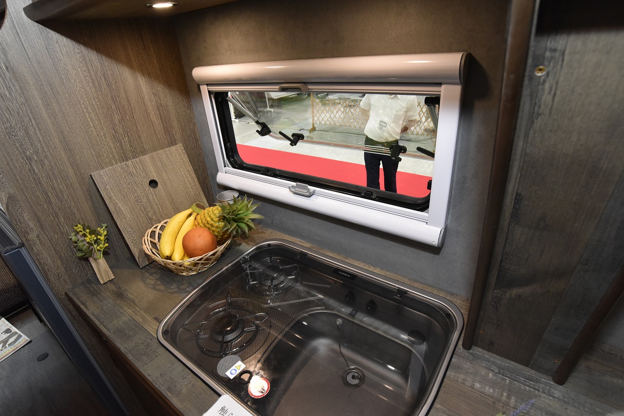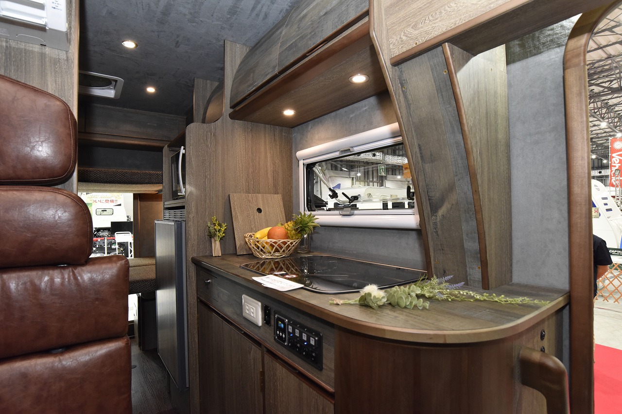 エクステリアは、一般的なキャブコンのシェルでは運転席上部にあるバンクが無いところが大きなポイント。このバンクを無くすことで、流れるようなボディラインを形成している。車両左の後部には車外で使えるシンクが設えられ、アウトドアでの汚れや食事の支度などでも活用できそうだ。加えて、リヤには大きな荷物の出し入れの際にも重宝できる、縦長の開口部に横開きのドアを採用し利便性を高めた。