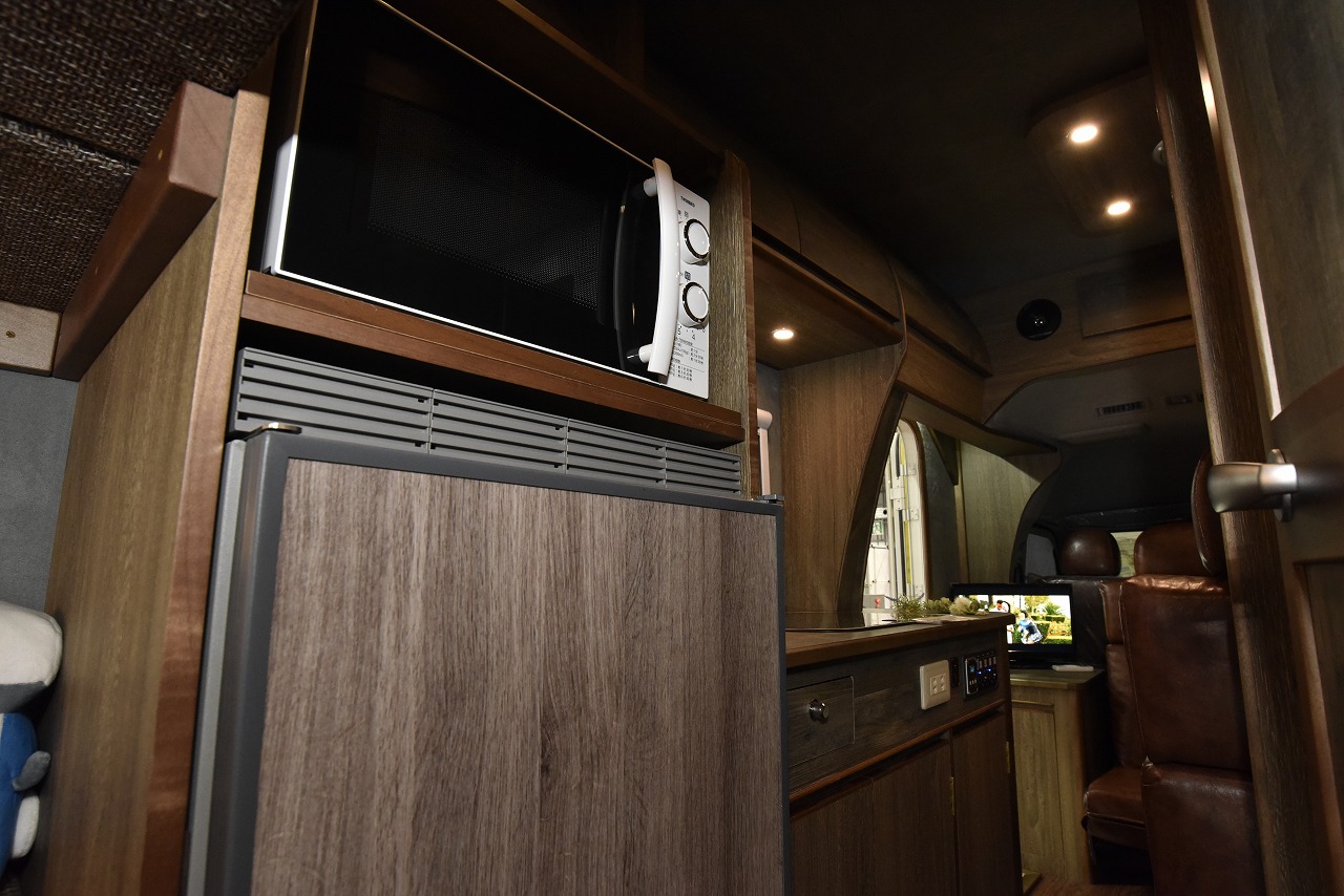 室内はセンターエントランスとし、中央にリビング、後部に常設も可能な2段ベッドというレイアウト。2列目のシートは前向きのほか、後向きにすることで対面ダイネット、ベッド展開すると1900mm×1200mmのスペースにもなる。エントランスの近くには2口コンロを持つキッチン、電子レンジ、冷蔵庫を装備し、旅先で調理をすることも可能だ。