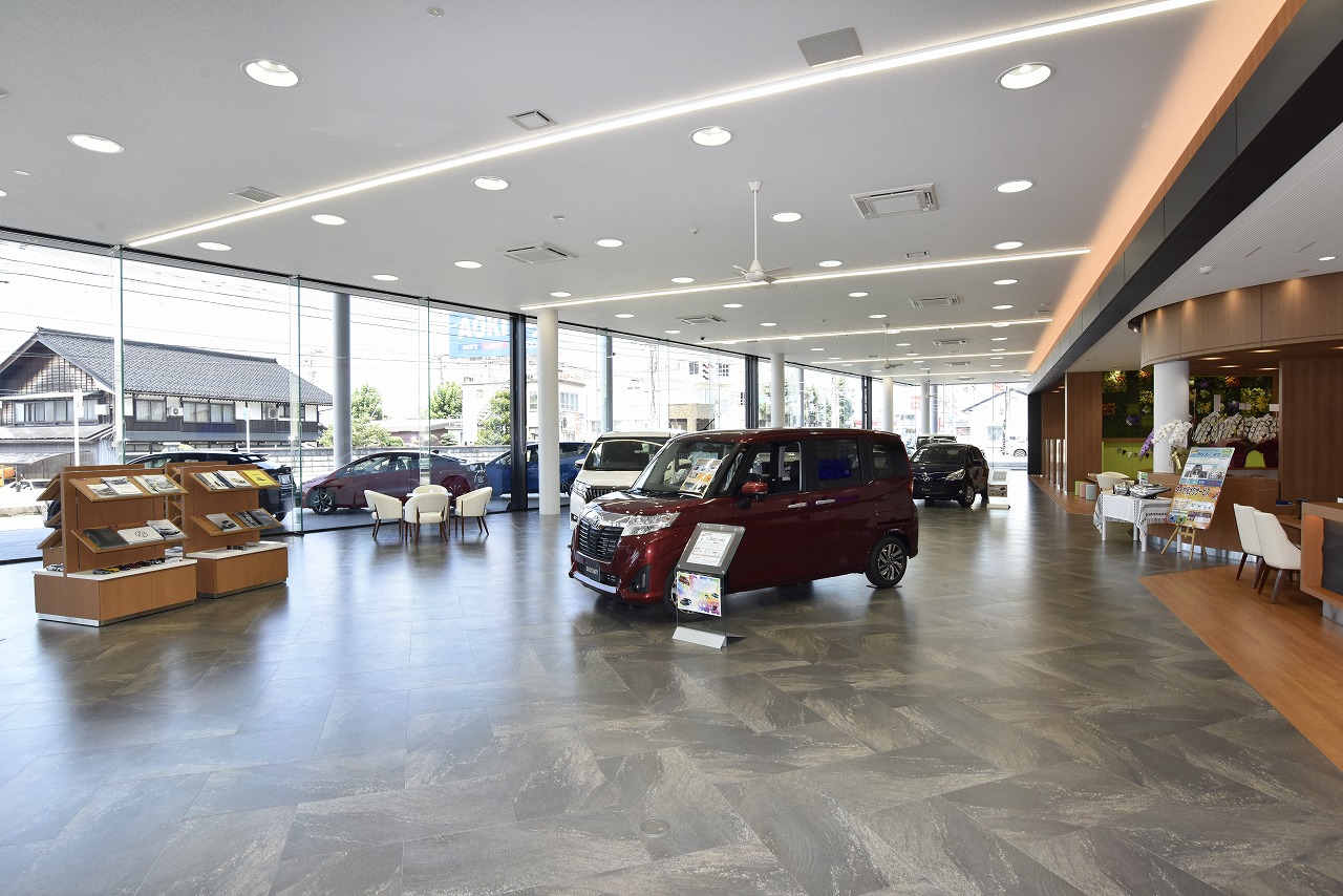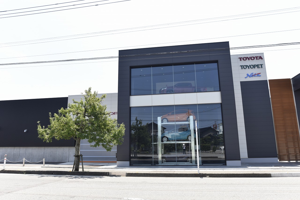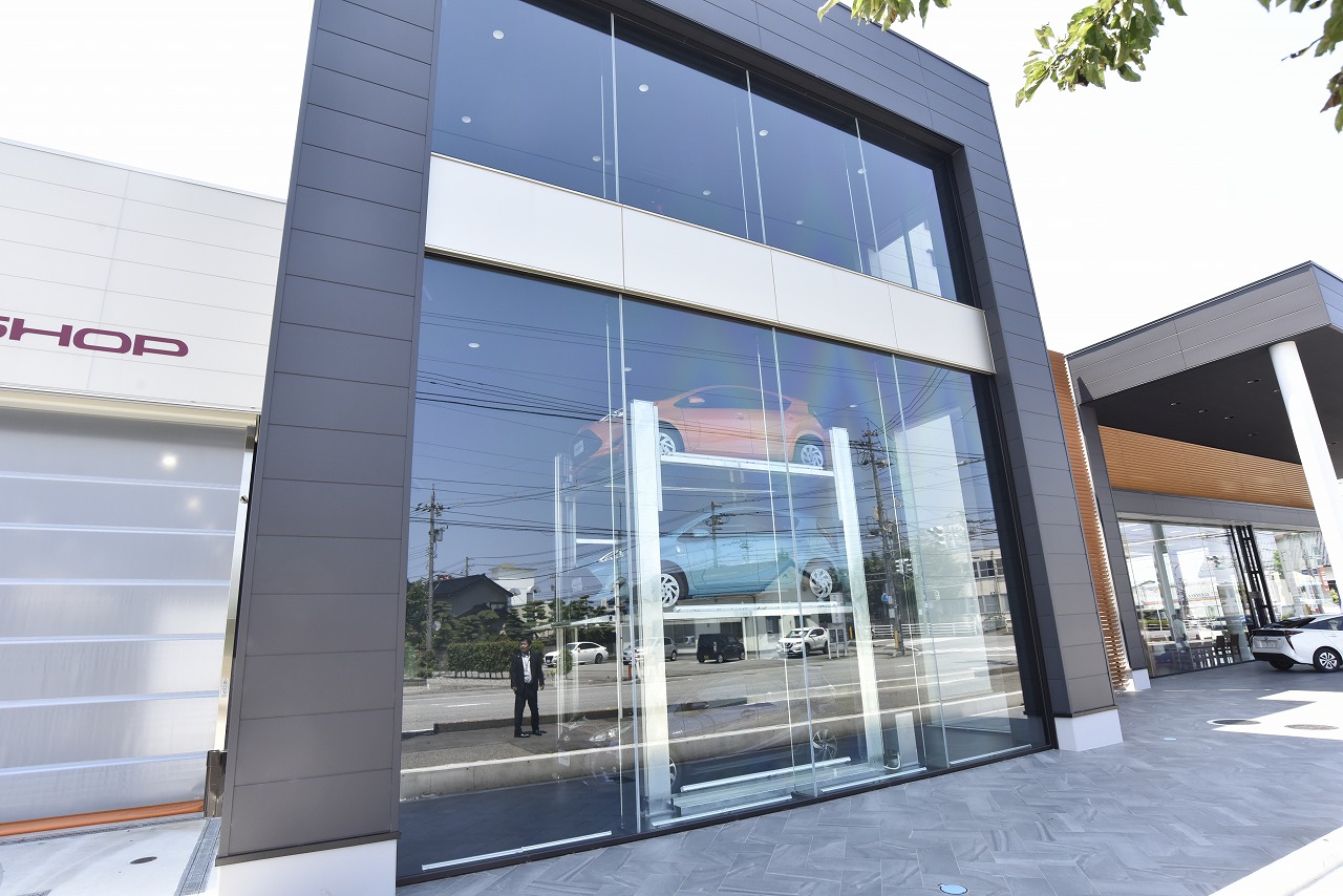 魚津店は、魚津市街地から程近い場所に立地し、北陸道・魚津ICからのアクセスも良好。黒を基調とした外観と軒先に並べられた展示車が目を引き、3層で構成されるガラス張りの立体展示場も同店舗の大きな特徴となっている。