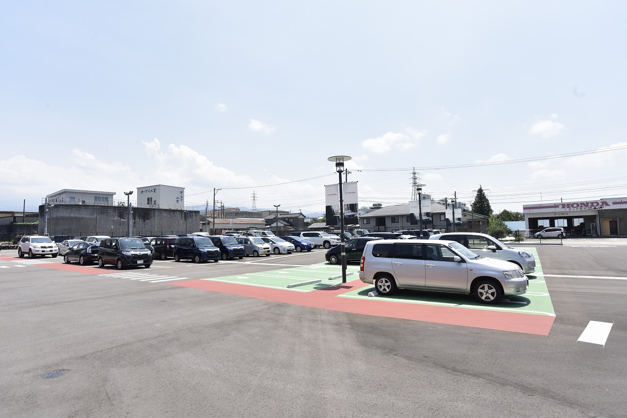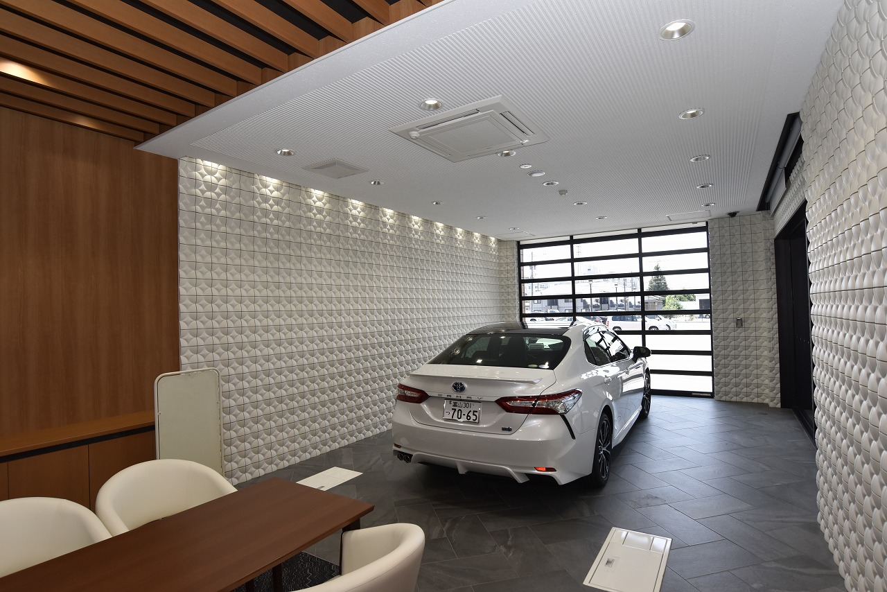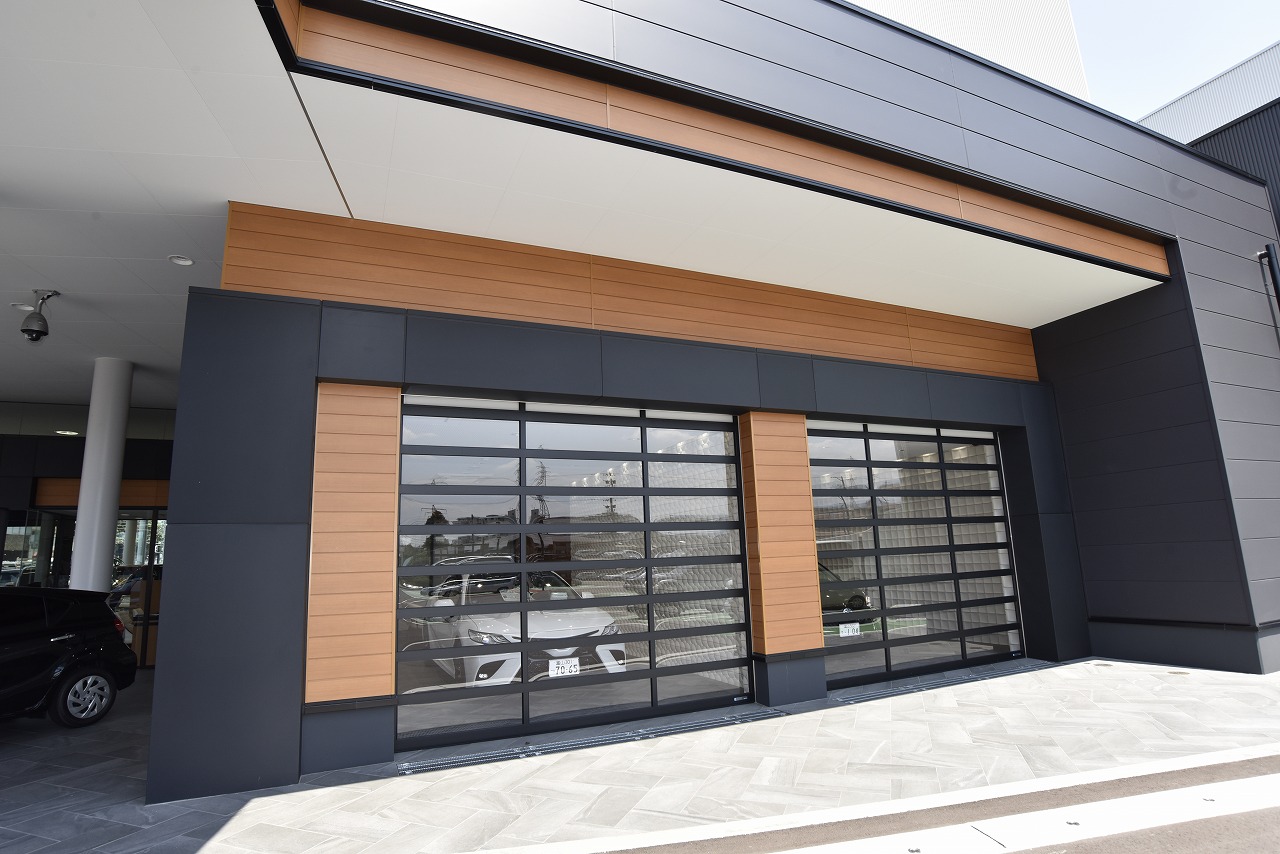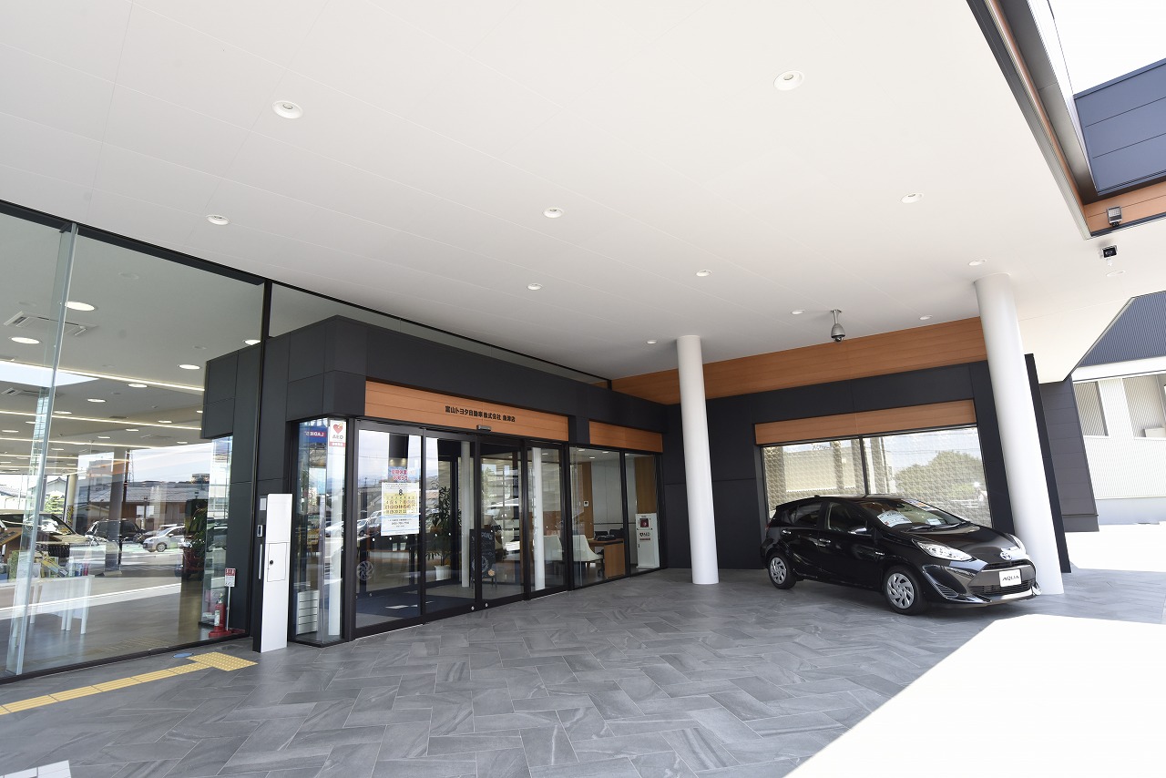 魚津店は、魚津市街地から程近い場所に立地し、北陸道・魚津ICからのアクセスも良好。黒を基調とした外観と軒先に並べられた展示車が目を引き、3層で構成されるガラス張りの立体展示場も同店舗の大きな特徴となっている。