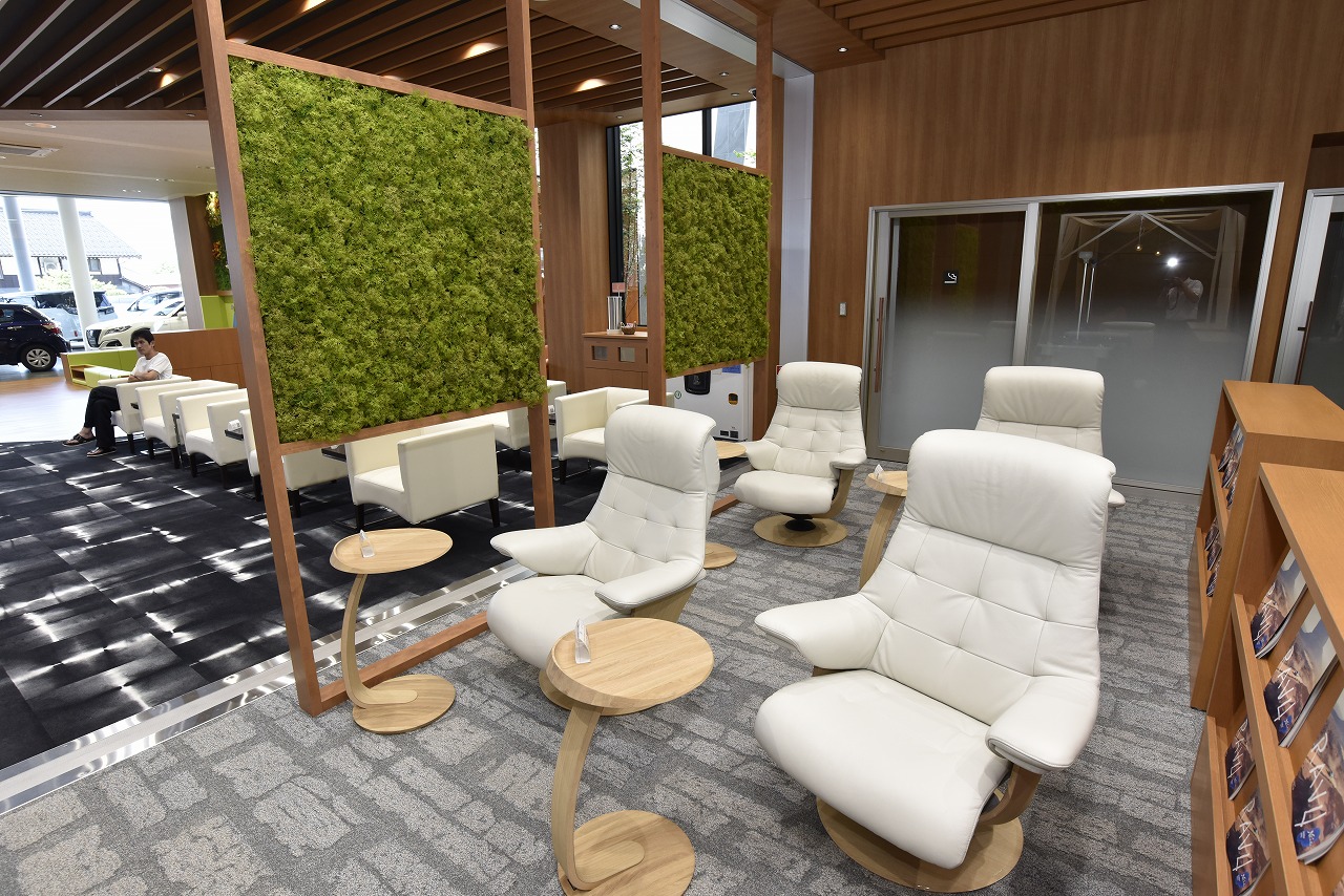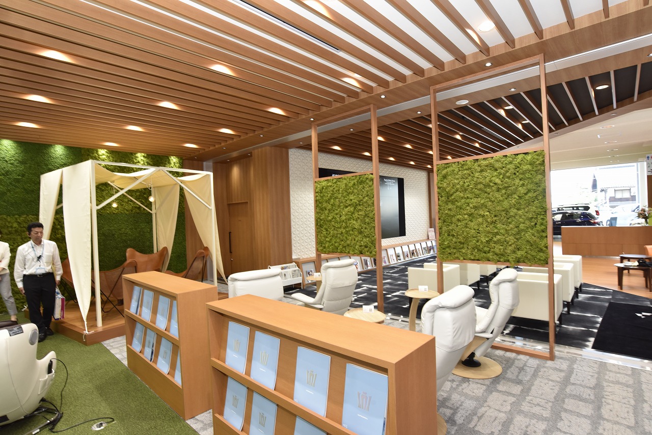 中でも待合ラウンジには、モニターが9面配された165インチ大画面マルチビジョンをはじめ、読書にも最適な高級感のあるリクライニングチェア、マッサージチェア、グランピングの雰囲気を再現したスペースなど、ゆったりと寛げるスペースを設け新たなディーラー像を提案している。