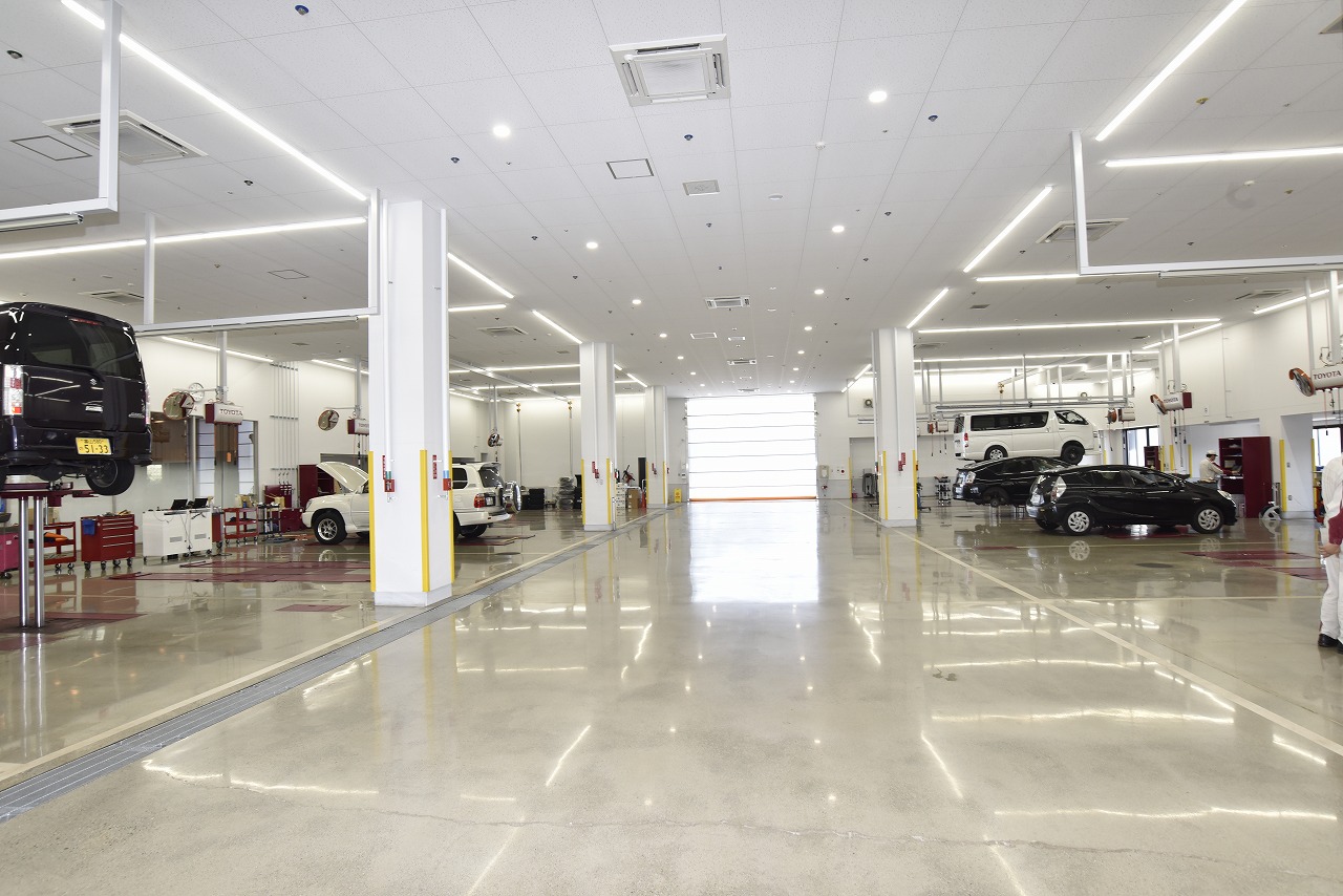 さらに、従業員向けのスペースとしてバックヤードや更衣室の使い勝手を大きく向上させ、社員食堂や託児所スペースも新設。12ストールある整備工場は冷暖房と床暖房を完備し、LED照明を採用することで、季節や天候に関わらず作業に集中できる環境が整えられている。山本信也店長は「お客様だけでなく従業員の満足度を高めていきたい。それがモチベーションとなって店舗の実績にもつながってくる」と話し、従業員の働きやすさを考えた設備や動線を店舗の設計段階からの構想を上手く具現化できたと手応えを語った。