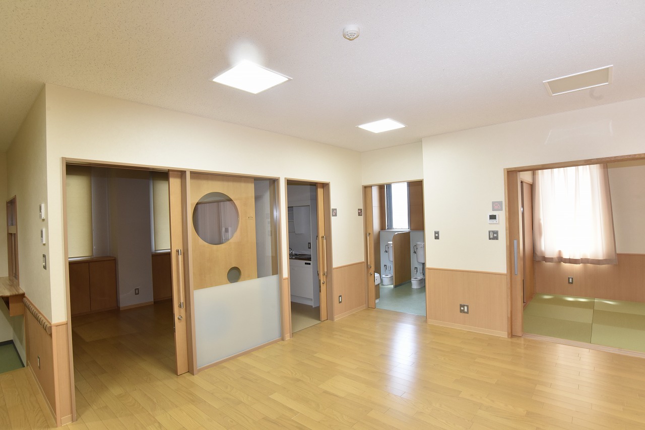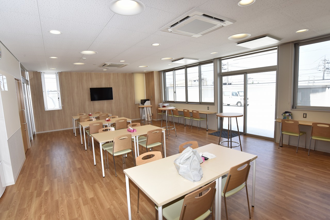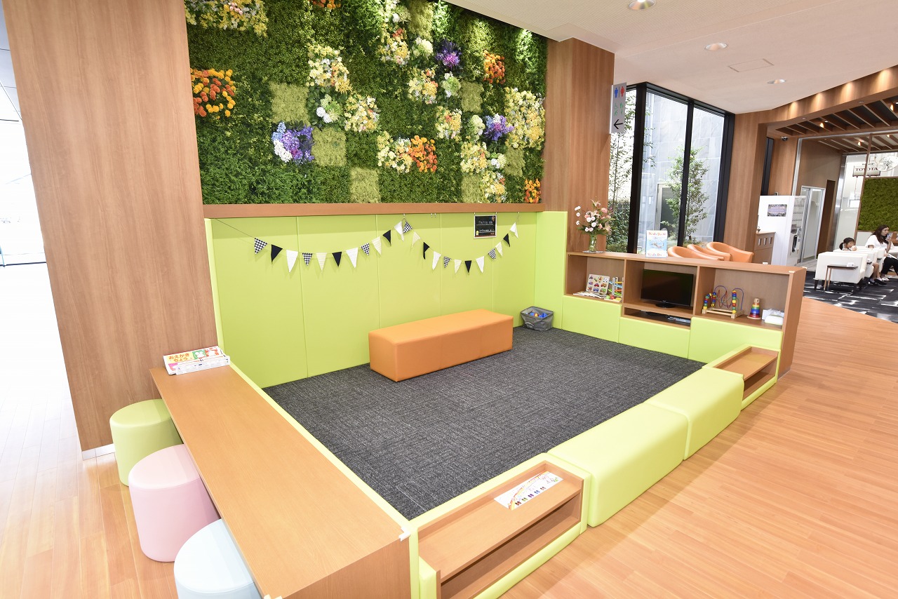 ディーラーとしては珍しい社員食堂(写真左)や託児所スペース(写真右)も完備する