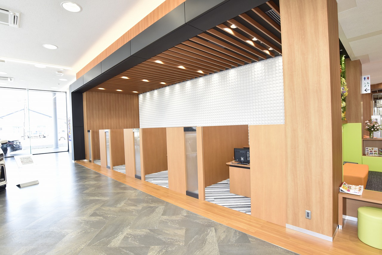 天井高4.5mと開放感のあるショールームは、白を基調とし木目の風合いが温かみのある空間を演出。広々としたスペースを活かし、納車室は2室備えられ、車両展示だけでなく、コンサルティングスペースや待合ラウンジもゆとりのあるつくりとなっている。