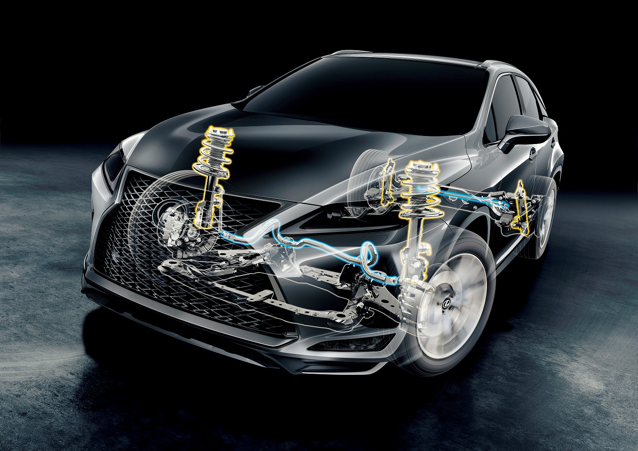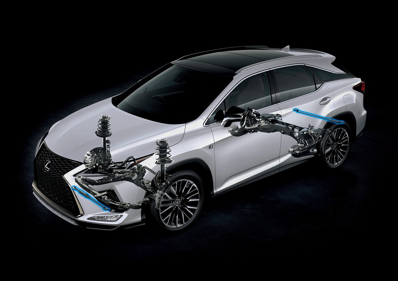 “F SPORT”らしいスポーティな走行性能を追求し、“F SPORT”専用チューニングを施しています。しなりや微振動を速やかに吸収するパフォーマンスダンパーをフロントとリヤに装着したことで、ハンドリングの特性を一層シャープにするとともに、乗り心地と静粛性の向上を実現。さらに、瞬時にロールを抑制する電動アクティブスタビライザーを採用することで、よりフラットな車両姿勢としている。
