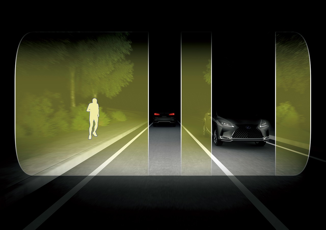 世界初採用のブレードスキャンアダプティブハイビームシステム(AHS)は、光源であるLEDからの光を高速で回転するブレードミラーに照射。ブレードミラーに反射した光が、レンズを介して高速移動しながら前方を照らす新機構のAHSとなる。残像効果で光は動いているように見えないが、ブレードミラーの回転に同期させて、LEDの光を適切なタイミングで点灯・消灯することで、配光を細かく制御することが可能となっている。これにより、従来のAHSより細かい遮光が可能となり、ハイビームの照射範囲を広げることができ、対向車や先行車を眩惑することなく早く歩行者や標識の認識に貢献する。
