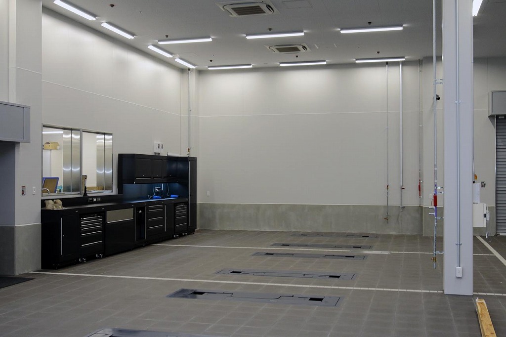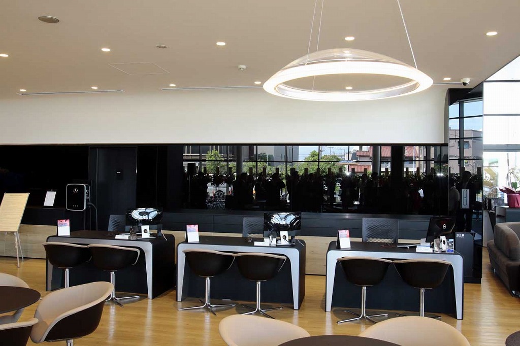 天井が高く自然光が降り注ぐ明るいショールームは、8台を展示で広さを持ち、敷地内の屋根付きスペースには認定中古車12台を展示する、メルセデス・ベンツ幕張サーティファイドカーコーナーも併設。空調の効いたサービスワークショップは、6ベイと検査ラインを持つ。