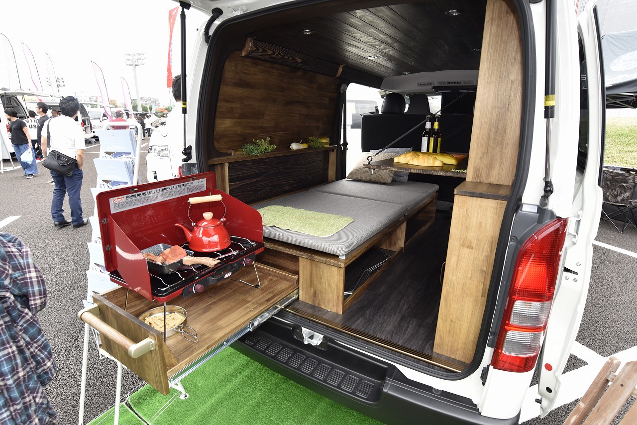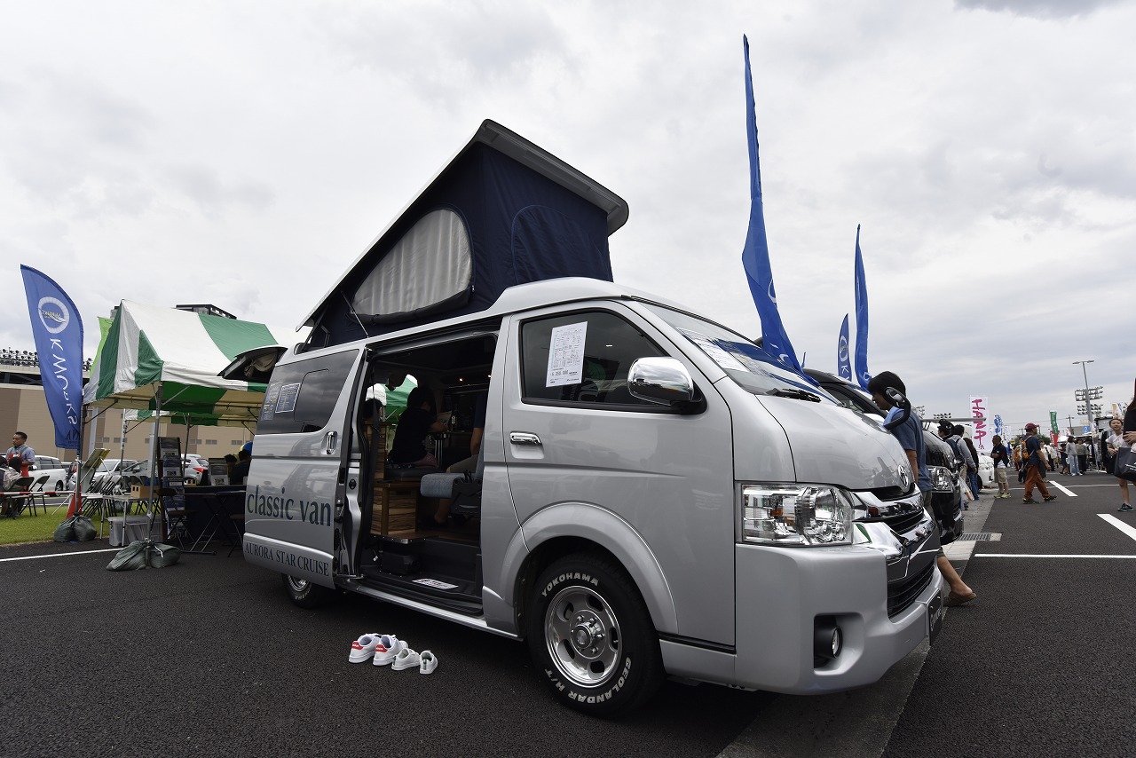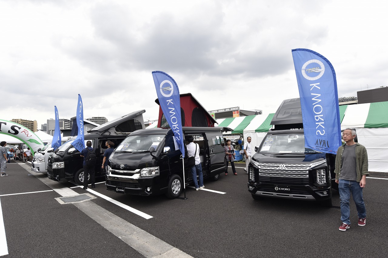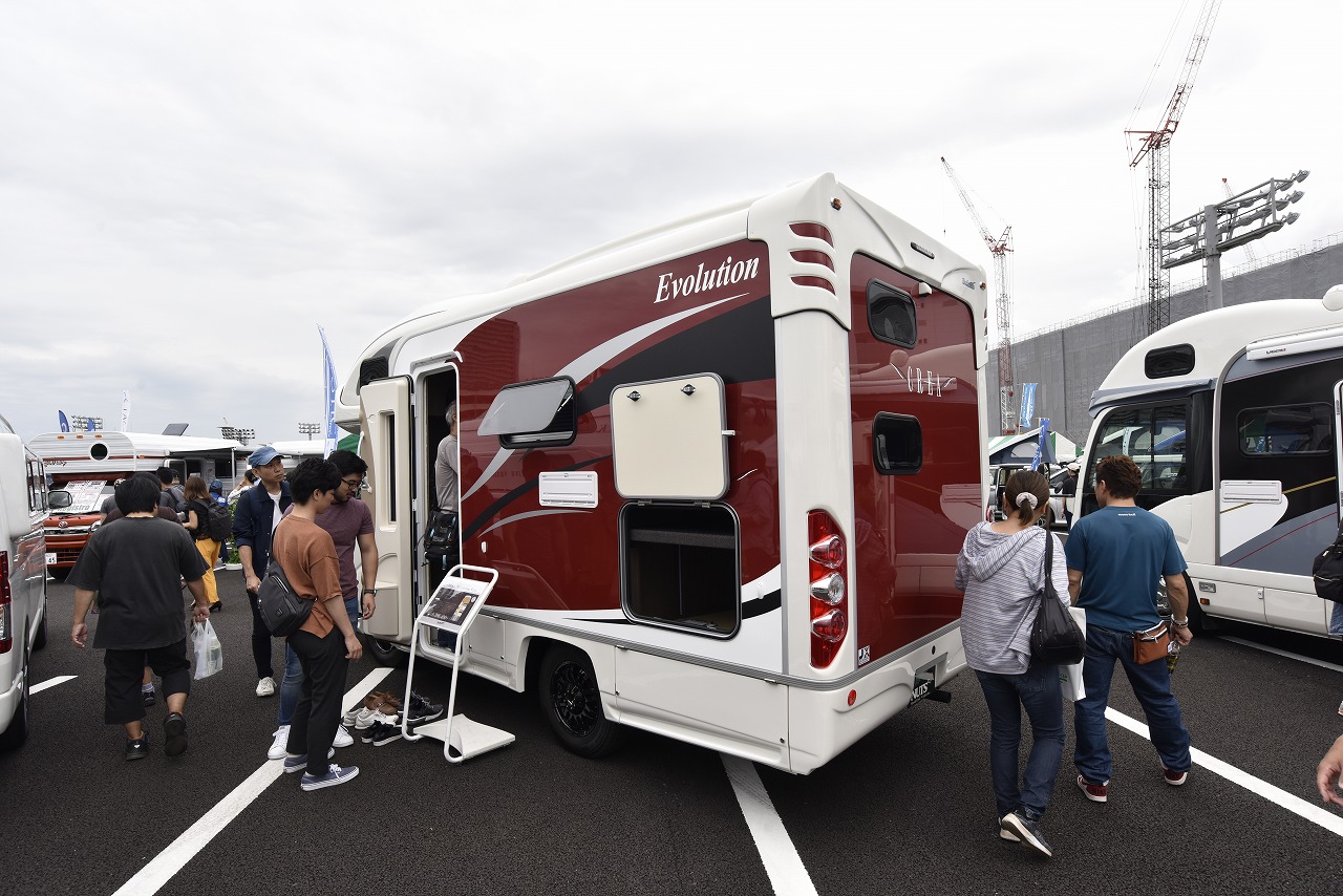 展示スペースには各社が話題のモデルや定番の人気車種に加え、豪華絢爛なトレーラーまでさまざまなタイプが揃った。優れた使い勝手や都市部での取り回しの良さから各社が力を入れているバンコン、軽キャンパーの出展台数が多く、来場者は購入を検討している20~30代のファミリー層が多く見られた。
