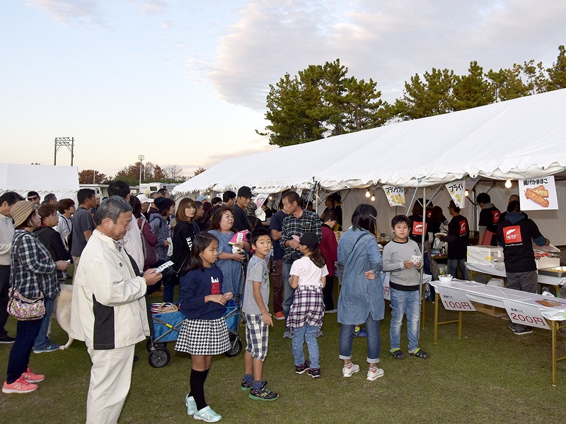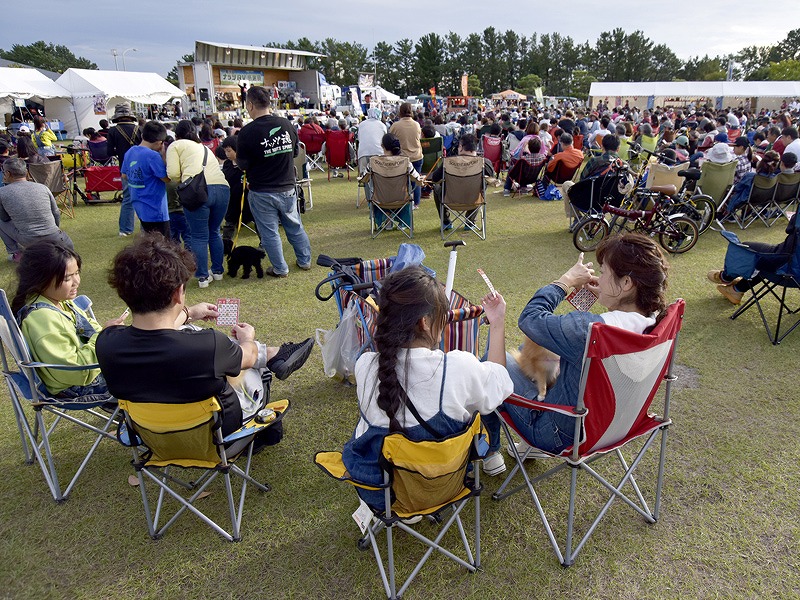 日没を迎える頃には、イベント広場のフードコーナーや縁日が次々とオープン。夜のステージショーも幕を開け、フォークライブを皮切りに、地元浜松市出身の女流落語家で真打の林家ぼたん師匠による落語、パンダ・モンキーズの沖縄音楽と歌謡ショー等が公演された。オーナーからは「キャンプイベントで落語が楽しめるとは驚き」といった声も。