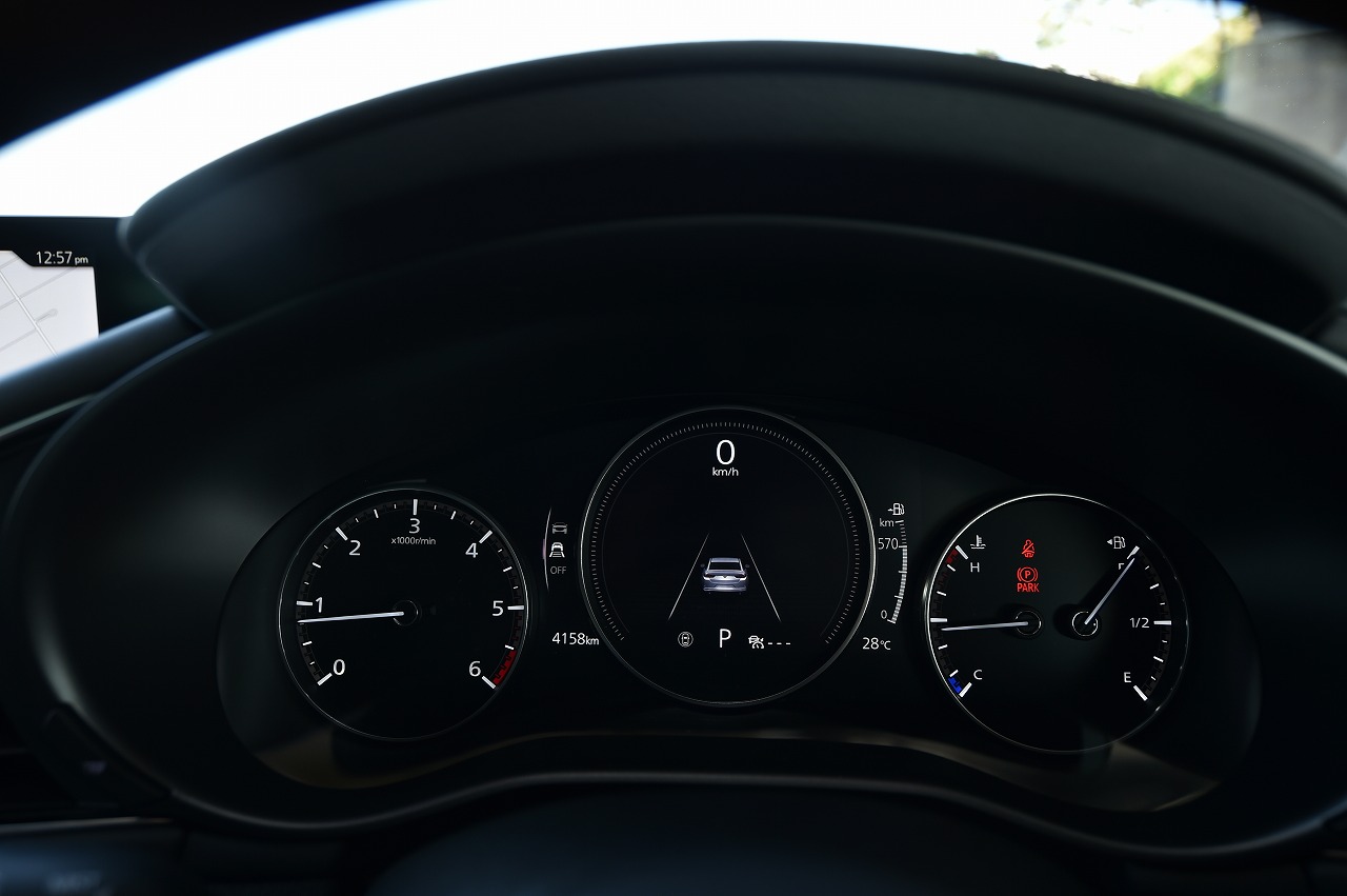 まずはディーゼルモデル(最高出力116PS/最大トルク270Nm)から試乗。近年のマツダのディーゼルは非常に完成度が高く、どのモデルに乗っても不満を覚えることはないが、MAZDA3のディーゼルにおいてもその印象は不変。特有のカラカラ音はほぼ遮音され、エンジンから伝わる振動は微小に抑えられている。低回転からの太いトルクを発揮するので街乗りでも扱いやすく、踏み込んだときのスムーズな吹けあがりはディーゼルとは思えないものに仕上がっていた。