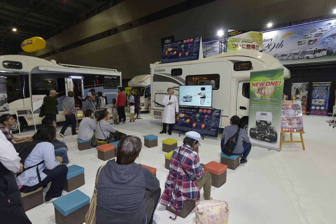 展示スペースには各社が話題のモデルや定番の人気車種に加え、豪華絢爛なトレーラーまでさまざまなタイプが揃い、イベント限定の特選車両や購入特典も用意。目当てのキャンピングカーの内装を入念にチェックしたり、各社ブースではスタッフへ熱心に質問や商談をする姿が多く見られ、活況となった。