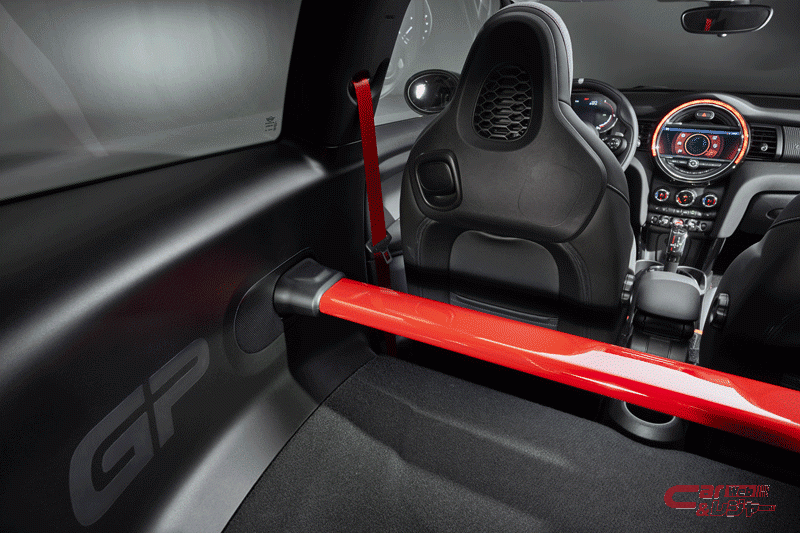 「MINI John Cooper Works GP」は、「MINI John Cooper Works」搭載エンジンに、クランクシャフトやベアリング、ピストン、コネクティング・ロッド、バイブレーション・ダンパーを最適化し、さらに、オイル供給やクーリング・システムを最適化した直列4気筒MINIツインパワー・ターボ・エンジンを搭載。ベースモデルとなるMINI John Cooper Worksより最高出力を75PS(55kW)アップさせ、最高出力306PS (225kW)、最大トルク450Nmを発揮する。