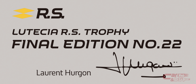また、ブラックエンブレム、ブラックシャークアンテナ、そしてルノー・スポールのテスト/開発ドライバーで、ニュルブルクリンク サーキットで量販FF車最速タイムを出したロラン・ウルゴン氏のサイン入りシリアルプレートを装備している。ルーテシアシリーズ(ルーテシア4)が、モデルチェンジにより新型ルーテシア(ルーテシア5)に移行するため、今回発売した「ルーテシア ルノー・スポール トロフィー ファイナルエディション」が、現行「ルーテシア ルノー・スポール」の最後の限定車となる。
