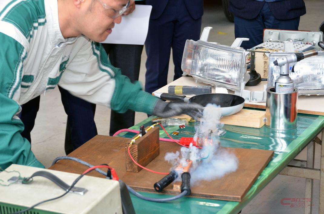 消防車両の格納庫内で、プリウス、ハイエース、C-HRの実車と大型モニターを使い、車両の構造、部品の名称や役割、電装や燃料の経路などを説明した。また、車両火災の原因の一つにも挙げられる、整備不良については日常点検を体験してもらった。ユーザー自身が行った配線が出火原因となることも多く、どの程度の過電流でヒューズが切れるか、あるいはショートによる配線焼損等を実験で示した他、過去の車両火災の事例を紹介した。