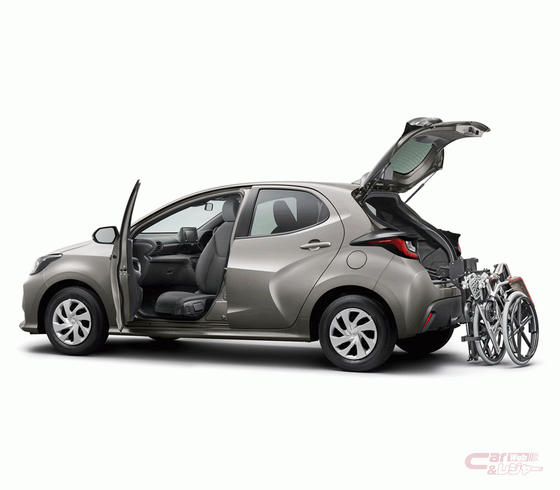 なお、新型車「ヤリス」には、ウェルキャブシリーズとして、35kgまでの車いすをラゲージルームへスムーズに収納できる「車いす収納装置付車」を設定している。電動のため、力が弱い介助者でも容易に積み下ろしが可能となっていおり、タイプⅠには、助手席が回転しながらチルトするターンチルトシートを、タイプⅡには助手席に加え、運転席にもターンチルトシートを標準装備している。