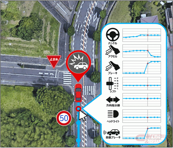 コネクティッドカーから取得する情報をもとに事故に至るまでの走行軌跡、アクセル・ブレーキ、シフトポジション、ステアリングの操作状況、指示器、安全装置といった各種装備の作動状況に関する車両データを可視化することにより、ユーザーが事故状況を説明する負担の軽減および迅速な事故解決を実現。