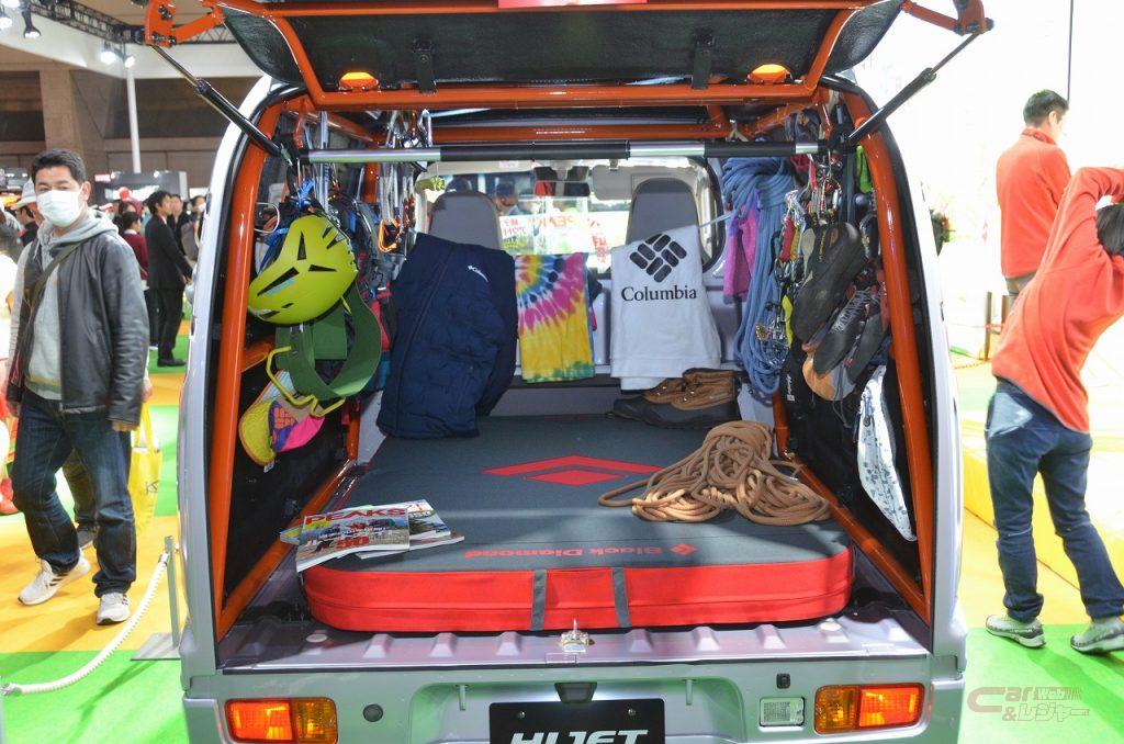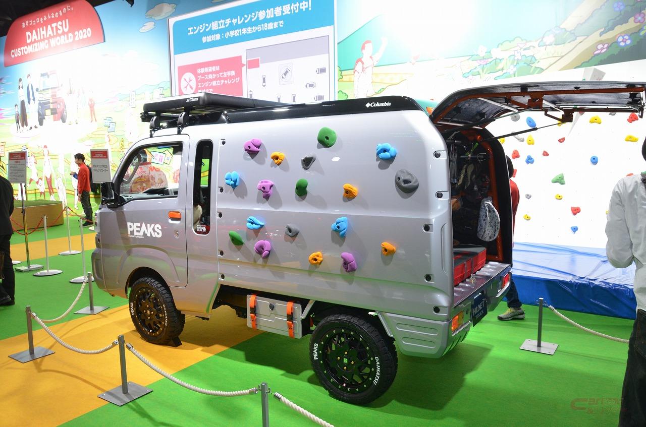 中でも、注目を集めているのがアウトドア雑誌「ピークス」とコラボレーションしたハイゼットトラックピークスバージョン。リヤにはシェルを搭載し、シェル外壁にはボルタリングのホールドを装着。さらにSUVらしさを強調するフロントバンパーやルーフライトバーも搭載し、商用車のイメージを打ち消す遊びゴコロあふれるモデルへと変貌した。