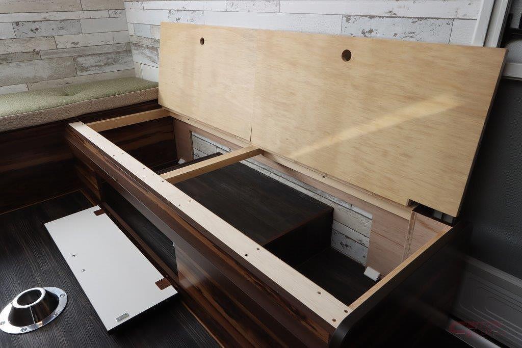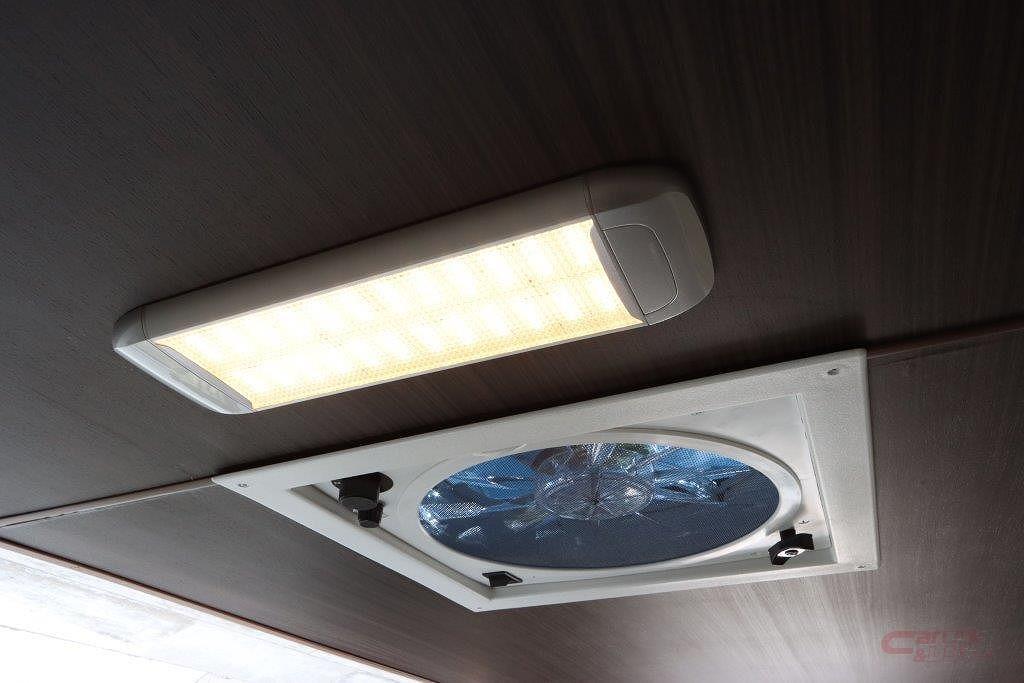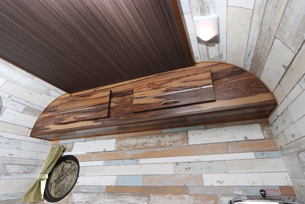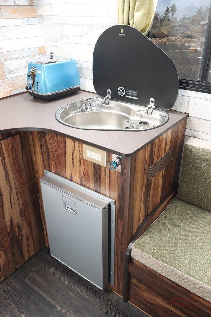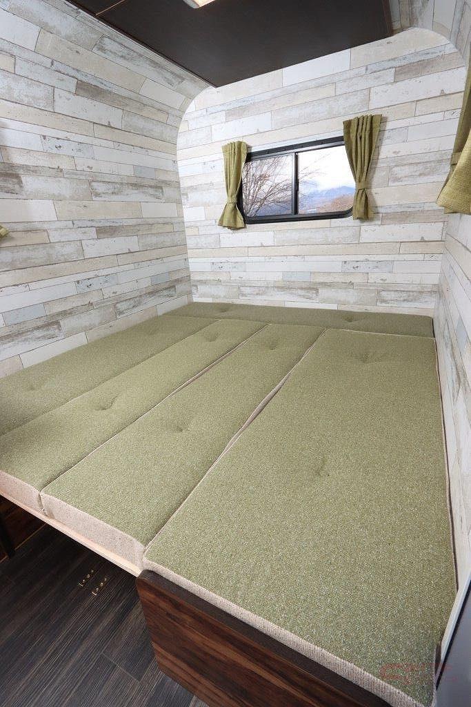 内装デザインは、レジストロシリーズの象徴であるウッドテイストを採用。室内はフロント側にキッチンスペース、リヤにコの字型のダイネットを配した。ダイネットはフルフラットベッド(奥行1800㎜×横幅1640㎜)に展開でき、大人3名が就寝できるスペースを確保している。