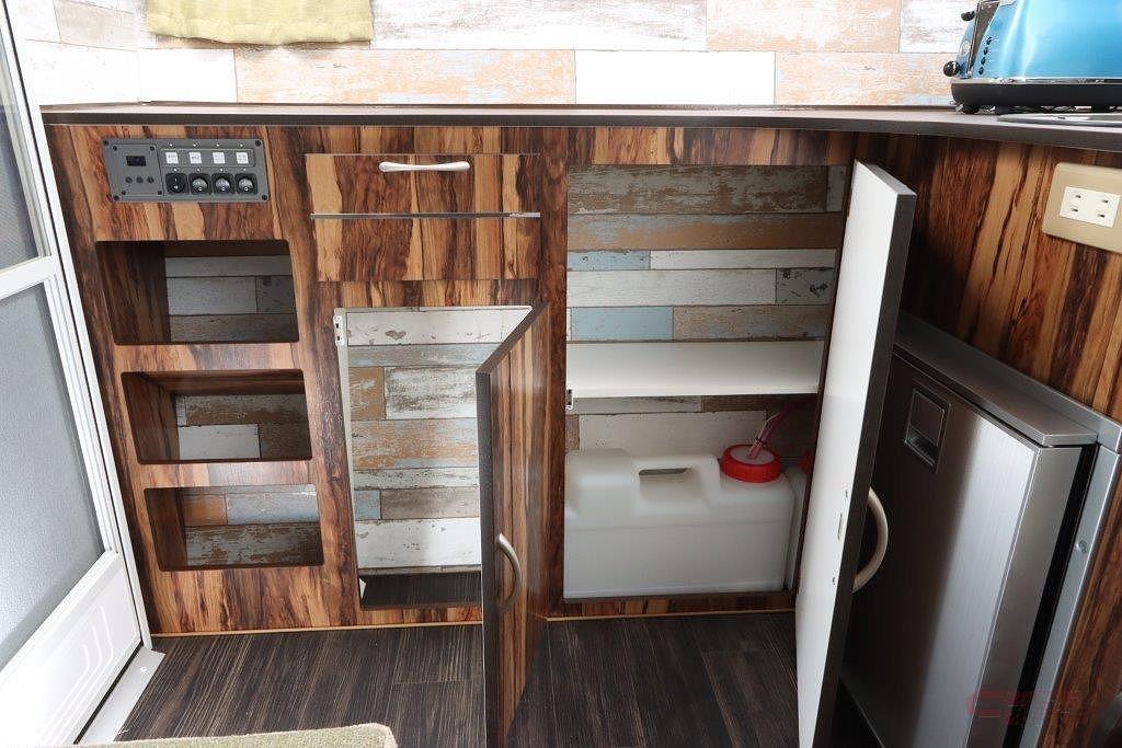 また、ヒッチメンバーを装着する前面のサイディングは、前方にせり出したように角度をつけた斬新なデザインで独特な存在感を放つ。既にSNS上で公開され、その斬新なデザインに注目が集まり「夫婦で使いたい」、「移動販売車として使いたい」との問い合わせも多いと佐藤社長は話す。