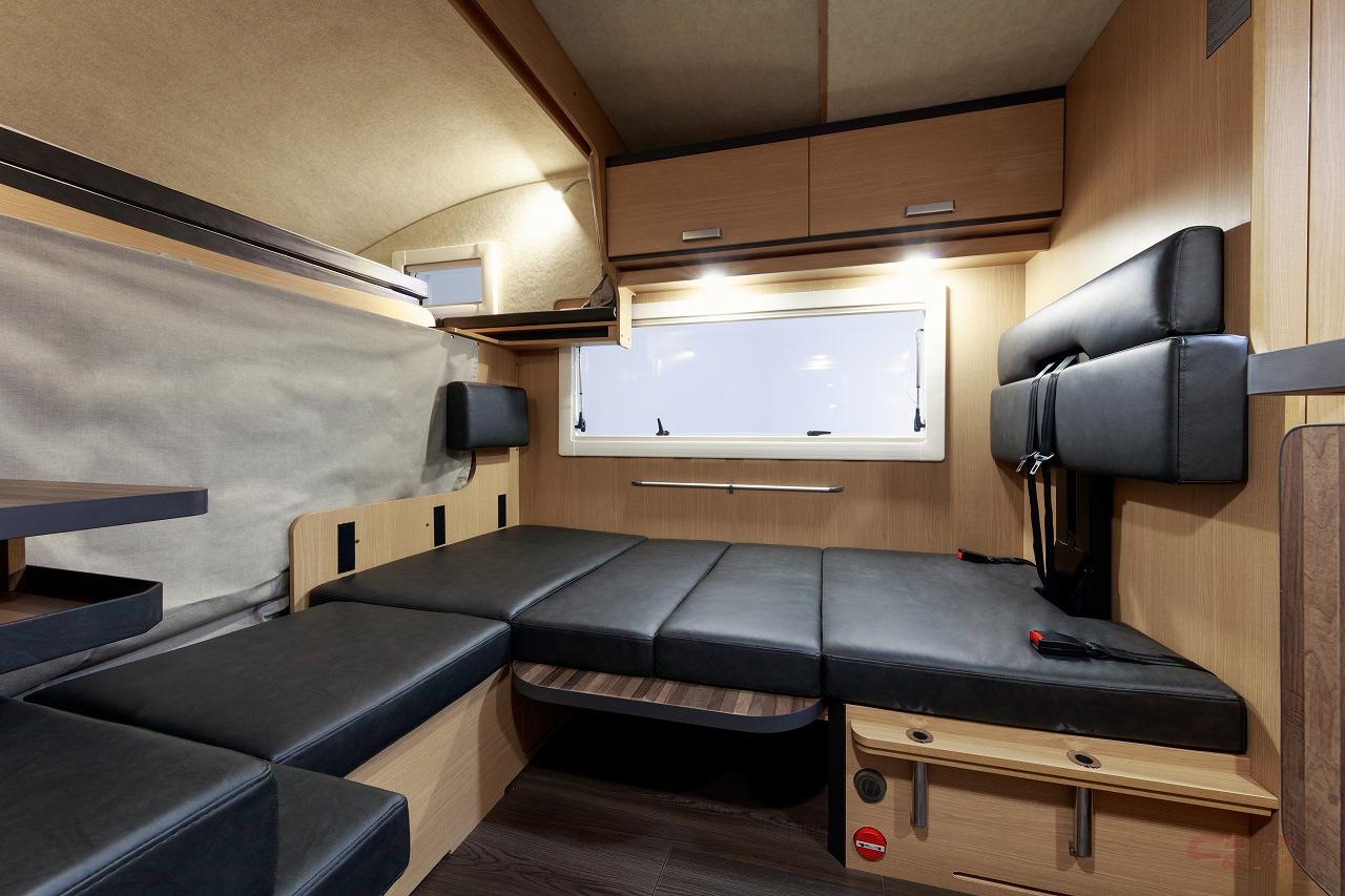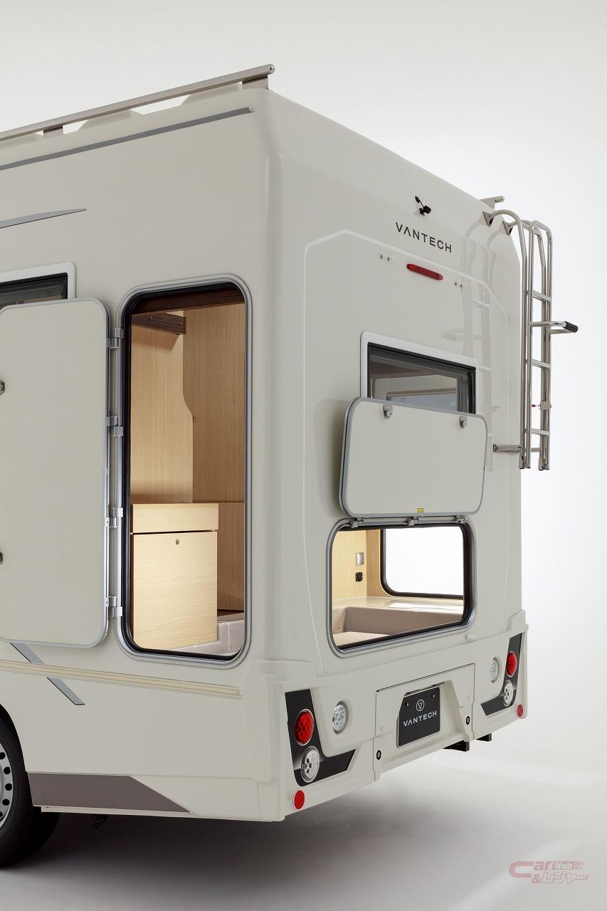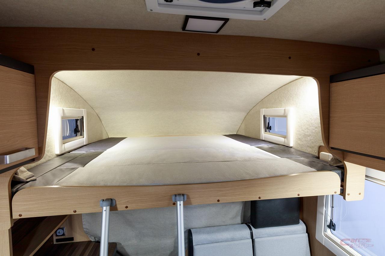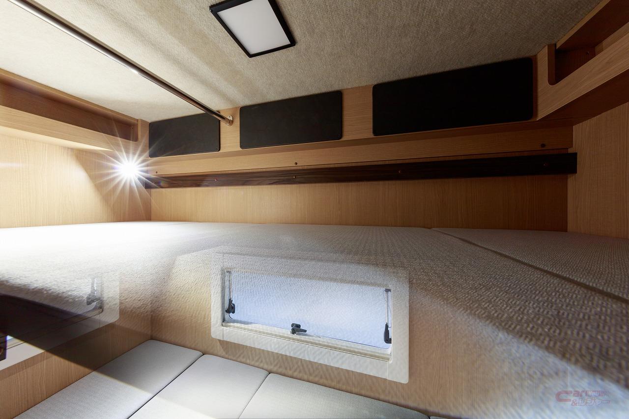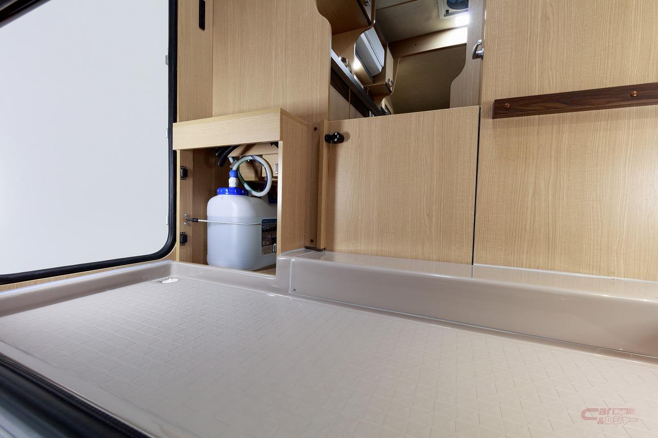 センターエントランスや、リヤの常設2段ベッドといったレイアウトは先代から継承しつつ、ベッドマットは脱着式とし、荷室高を約100mm高くすることで、トランクスペースとしての使い勝手を大きく向上。さらに、荷室の床面はFRPパンを設置して防水仕様とし、化粧板も傷の付きにくいポリウレタン製とすることで、よりタフな使い方にも対応できるようになった。