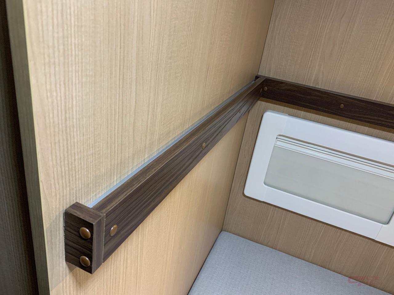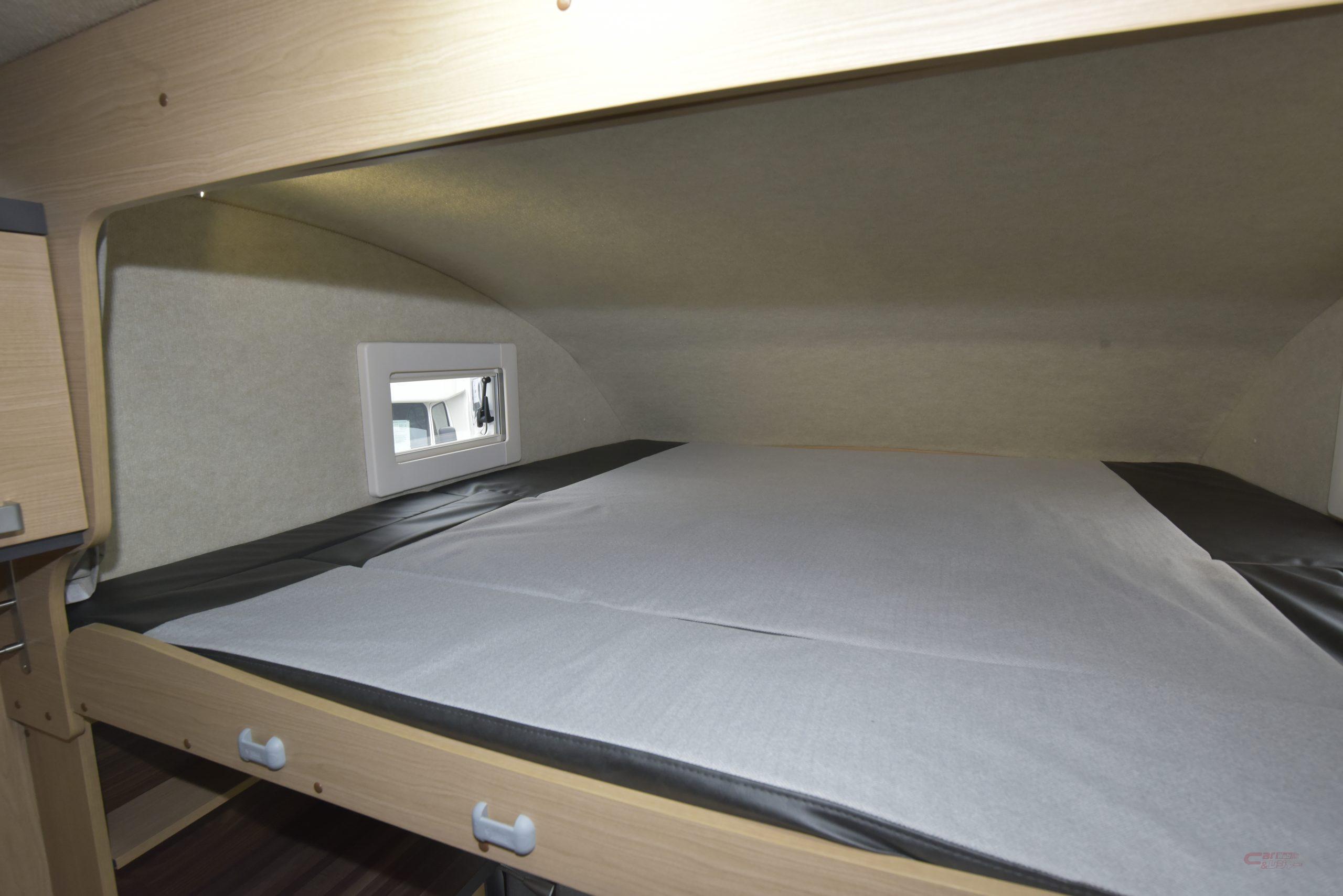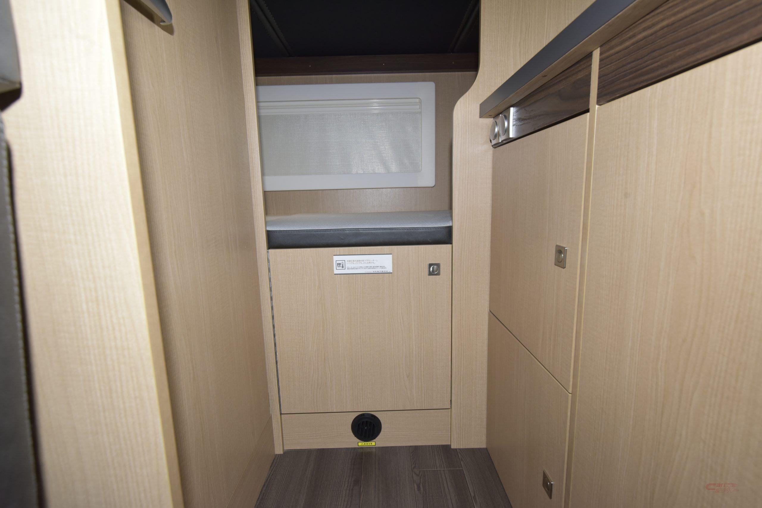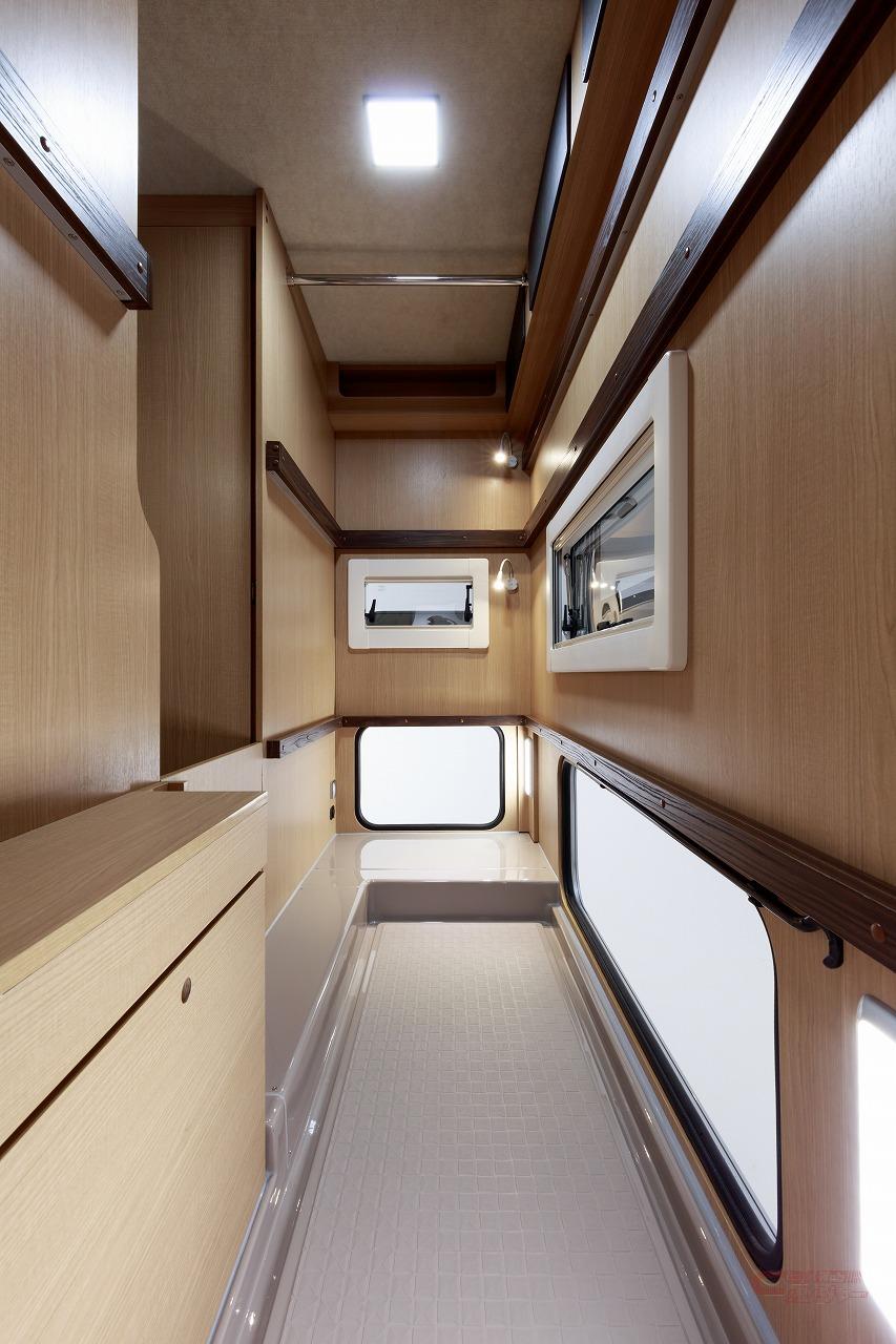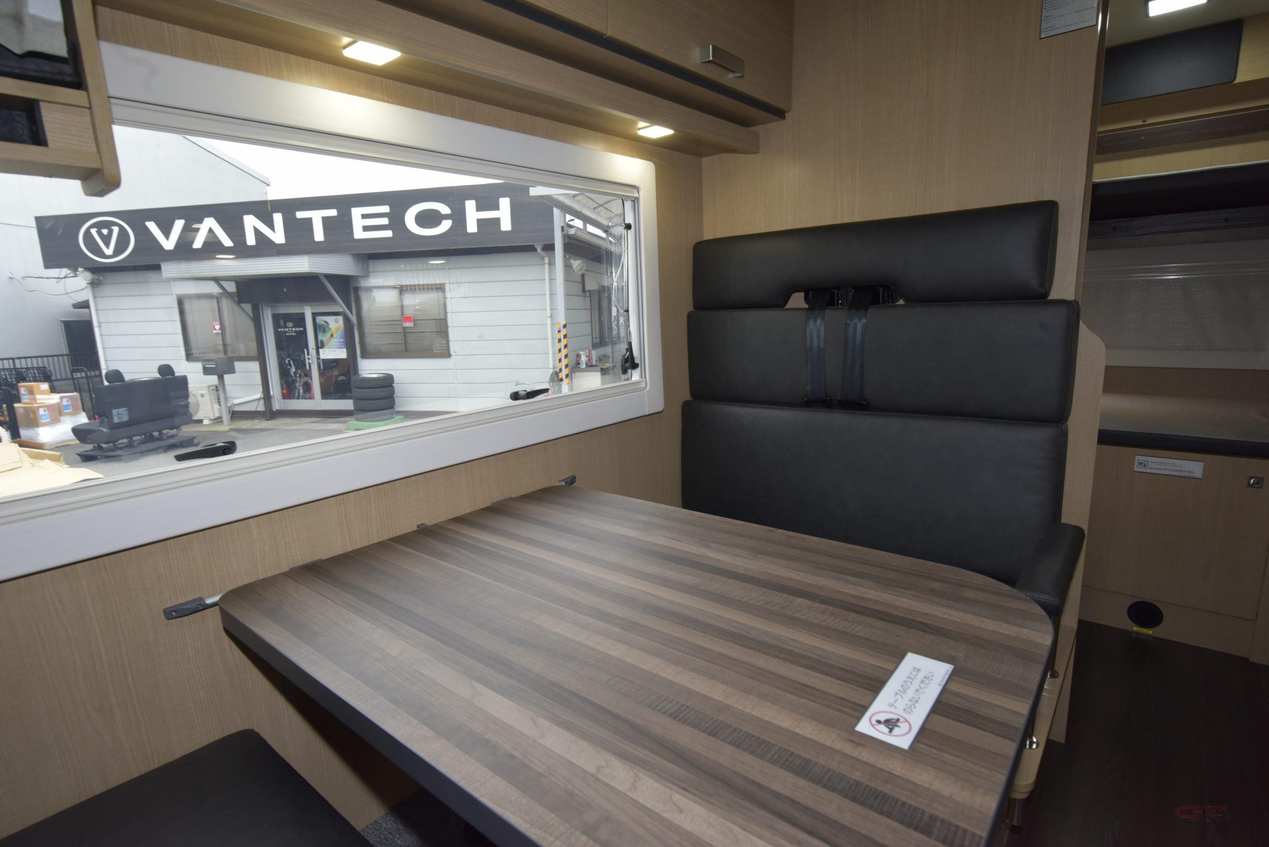 センターエントランスや、リヤの常設2段ベッドといったレイアウトは先代から継承しつつ、ベッドマットは脱着式とし、荷室高を約100mm高くすることで、トランクスペースとしての使い勝手を大きく向上。さらに、荷室の床面はFRPパンを設置して防水仕様とし、化粧板も傷の付きにくいポリウレタン製とすることで、よりタフな使い方にも対応できるようになった。