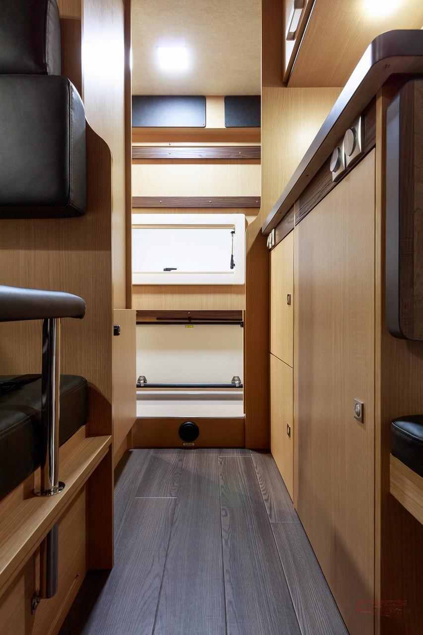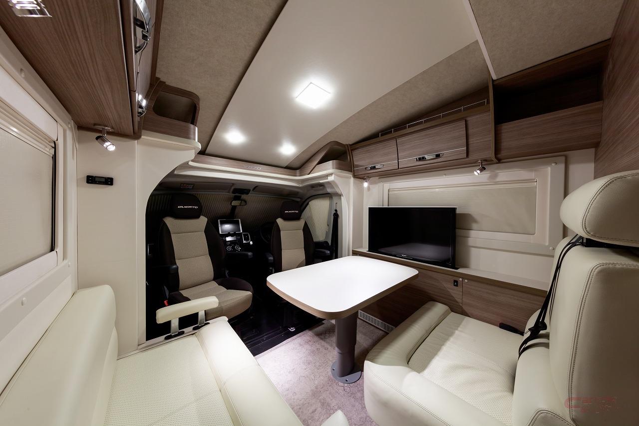 センターエントランスを採用した室内は、フロントにダイネット、リヤにはベッドをレイアウトするオーソドックスなスタイルとした。ダイネット部の前向きシートと横向きソファーは本革となっており、白基調の内装と合わせてフラッグシップに相応しい上質な空間とした。また、ダイネットスペースには液晶テレビを装備。室内から外の景色を楽しみたいときには、ボタン一つで格納することも可能となっている。