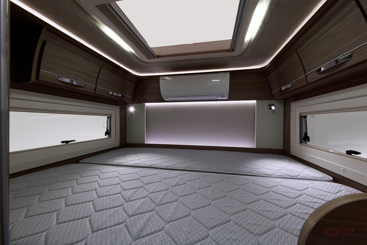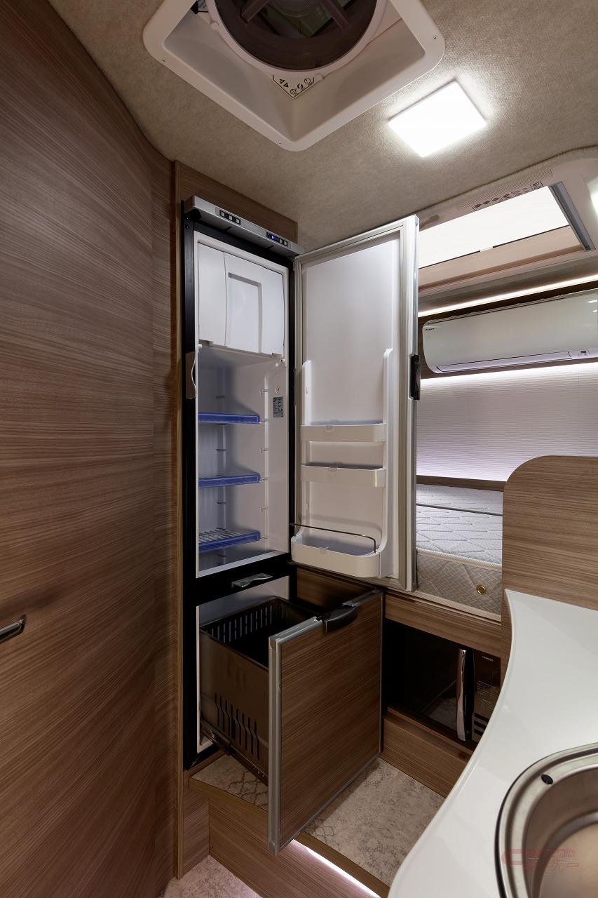 後部には、マルチルームやキッチン、150Lの大型冷蔵庫を装備。常設のベッドはダブルサイズのものとし、大人2名がゆったりと就寝できるスペースが確保されている。さらに、ベッドルームにはルームエアコンを標準装備し、天井部に網戸とシェードを備えたサンルーフが開放感を演出する。