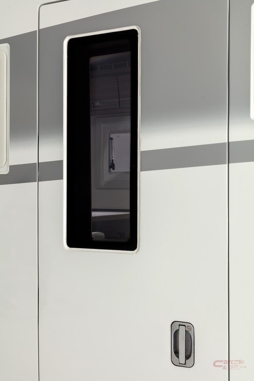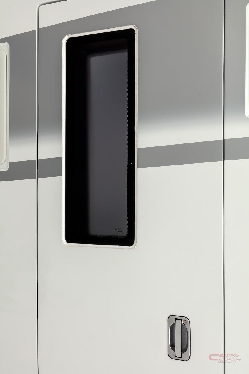 流麗なデザインとともにエクステリアで注目されるのは、専用設計されたオリジナルのエントランスドア。外からヒンジを見えないようにデザインすることで、キャンピングカーとは思えないような流麗なサイドビューを実現するとともに、半ドア状態でドアを自動的に閉めるオートクロージャー機能も採用。さらに、ドアのガラスは、ボタン操作で透過ガラスとすりガラスに切り替えることも可能で、高い実用性も備えている。
