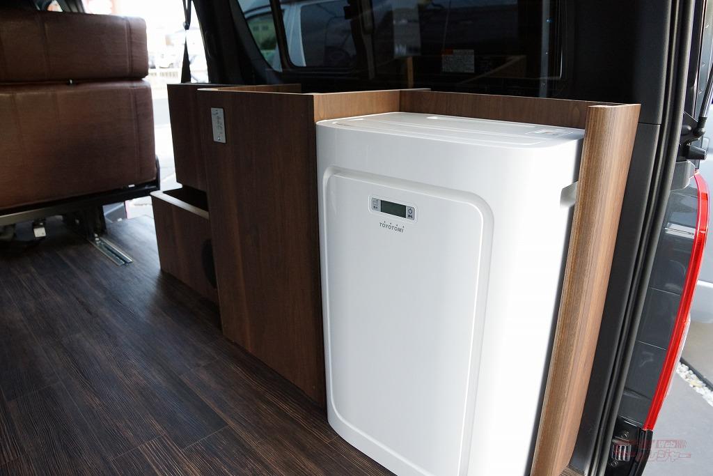 今回のイベントで初公開された「AURORA EXCLUSIVE(オーロラエクスクルーシブ)」は、同社の最上級バンコンとして、独自開発した300Ahの大容量リチウムイオンサブバッテリーシステム「メビウス」を搭載。270Wのソーラーパネルを組合せることで、電力消費の大きい家電の長時間稼働を実現し、エアコン、49ℓ大型冷蔵庫、電子レンジの標準装備を可能とした。