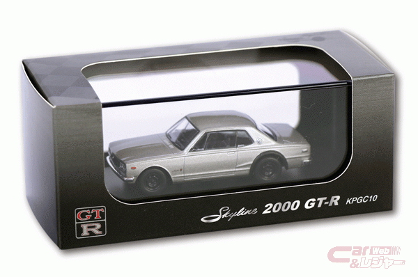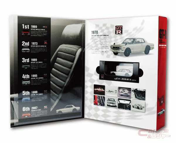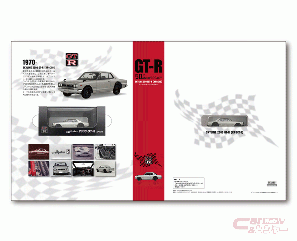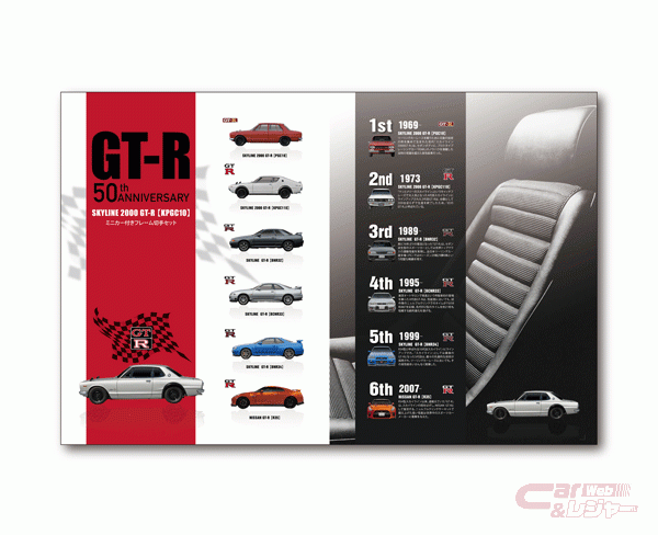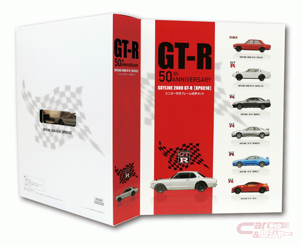 今回発売したフレーム切手セットは、昨年、50周年を迎えたGT-Rを記念するアニバーサリー商品として企画されたもので、初代から最新型までの各世代から厳選した写真で構成したフレーム切手とハコスカの愛称で親しまれた初代GT-Rの「スカイライン2000GT-R(KPGC10)」のミニカー及び特製ボックスの3点セットとなっている。なお、ミニカーは、シルバーのボディカラーにリアウィングの付いていない郵便局限定販売の仕様。