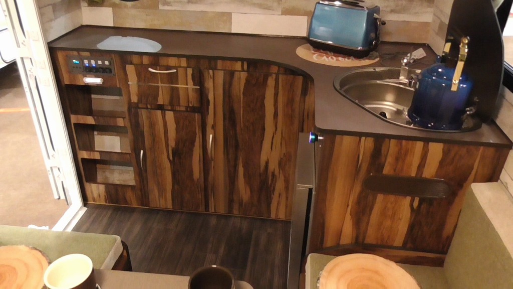 室内は、レジストロシリーズの特徴でもある全面木目調で、ログハウスのような温かみのあるインテリア。フロア前面にL字型キッチンを備え、食器や調理道具が収納できるスペースも確保している。また、キッチン上部には衣類やタオルの収納に便利なオーバーヘッドキャビネットも搭載する。