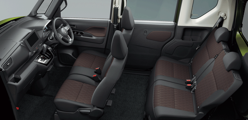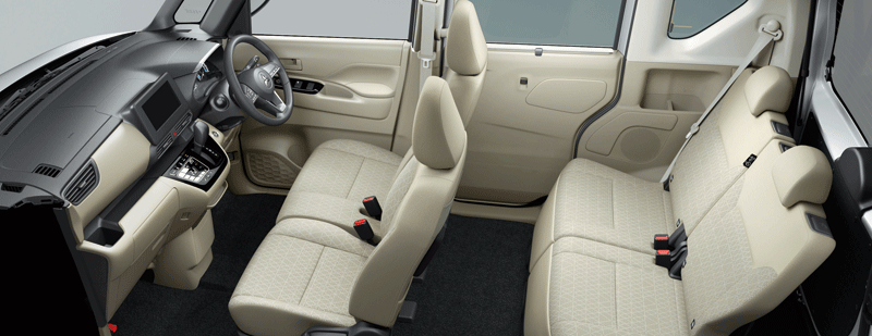 従来車からホイールベースを65mm延⻑して、広い居住空間を実現。子供のいるファミリーでの使用を想定して、リヤシートのスライド量をクラストップとし、後席足元の空間を従来車より大幅に広げることで、後席の居住性を最大化させた。また、メーカーオプションで前席セパレートシートを設定することで、室内での前後の移動がスムーズとなる。さらに、後席スライドドアは、開口幅を従来車より大幅に広げるとともに、ハンズフリーオートスライドドアを採用し、キックセンサーでドアを開閉可能となっている。ほかにも、室内の空気を循環させるリヤサーキュレーター(プラズマクラスター付)を設定し、後席での快適性を向上したほか、ラゲッジルームは床面⻑を従来車から拡大し、後席スライドを最前端の状態で48L のスーツケースを 4 つ積むことが可能となっている。