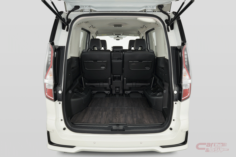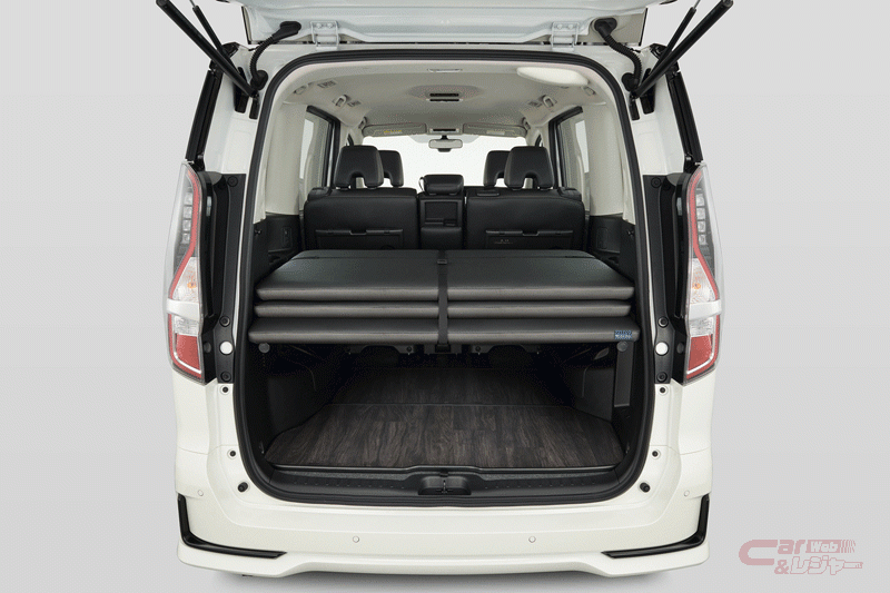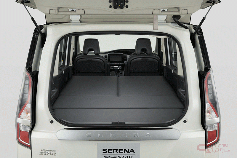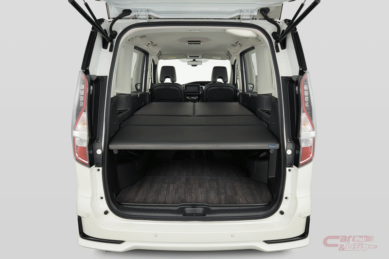 セレナ「マルチベッド」は、「XV」、「ハイウェイスターV」、「e-POWER XV」、「e-POWER ハイウェイスターV」グレードをベースとしており、いずれも「防水シート」を標準装備しているほか、ベッドボードにはシートと同じ防水性のある素材を採用している。また、ウェアや小物などを掛けることができる「サイドマルチパイプラック」や、釣り道具やサーフボードを積載するためのアイテムをオプション設定している。