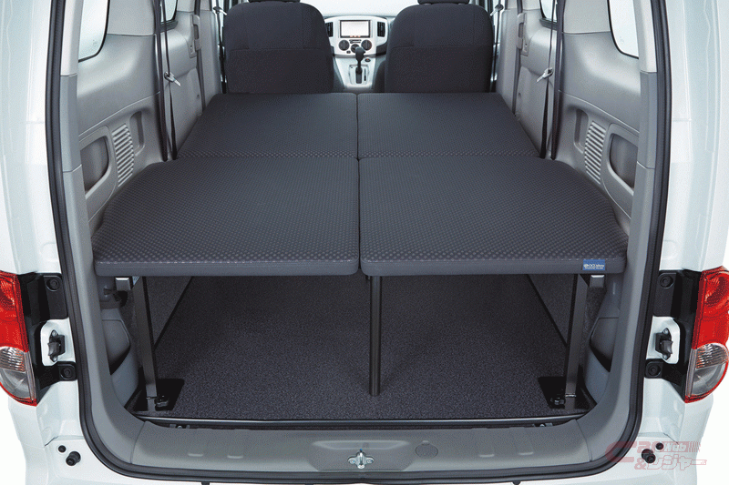 セレナ「マルチベッド」、NV200バネット「マルチベッドワゴン」は、2列シート・5人乗りのシートレイアウトと収納式のベッドシステムを備えることにより、高い実用性と快適な休憩のためのスペースを同時に提供するモデルで、宿泊施設を利用せずに車内で就寝できるほか、災害など、もしもの際には、一時的な避難場所として活用することも可能となっている。