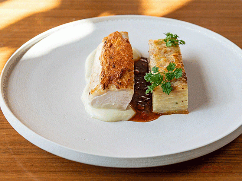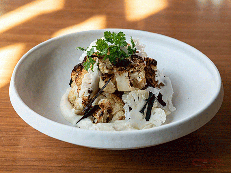 - フードメニュー(税込価格):ローストカリフラワー | アーモンドとブラウンバター 炭ネギ添え 1500円/タコのスモーキーロメスコソース 1700円/ふっくらチキン セロリのテリーヌ パースニップのピューレ クランベリーソース 1300円/バスクチーズケーキ 800円
