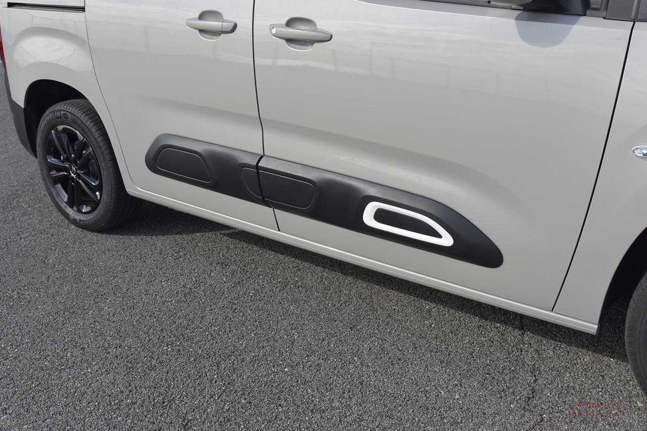 ブラックアウトされたAピラーや、デビューエディションの専用装備でもある16インチのアルミホイール、ルーフレール、そしてシトロエンの特徴でもあるサイドロアにあるエアバンプと呼ばれる衝撃吸収材のブラックが、ボディ全体をリズミカルに統一しています。
