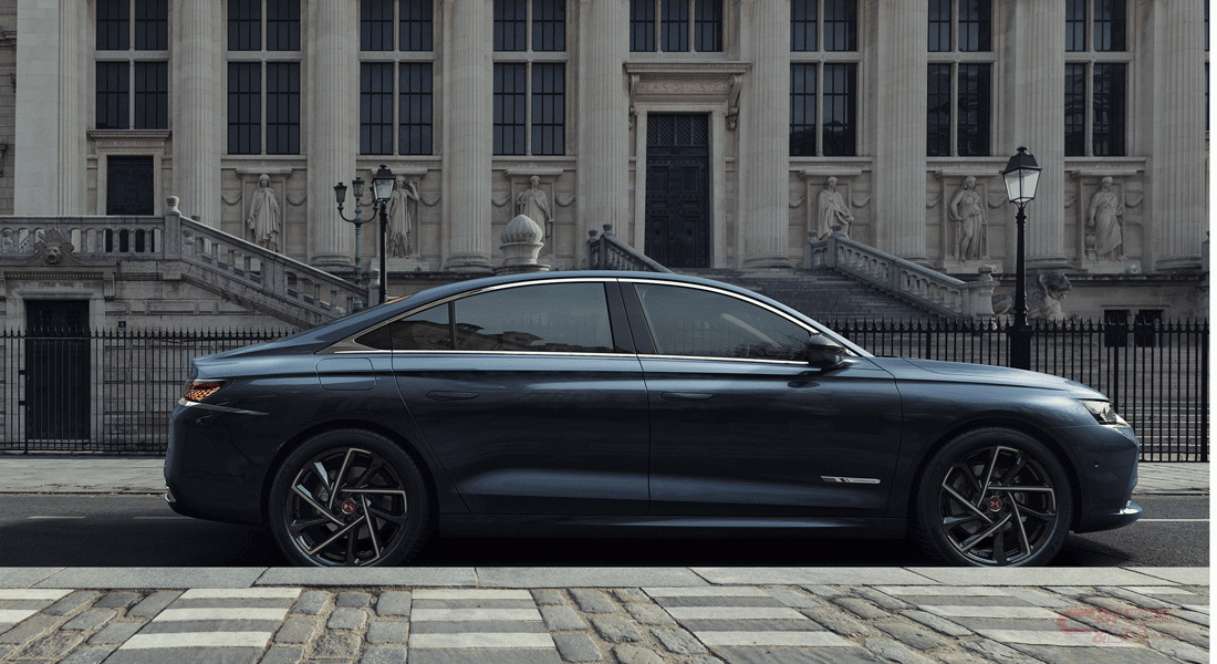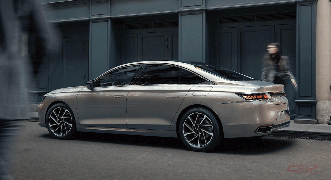 今回発表された「DS 9」は、全長4.93m/全幅1.85m、690mmの大径ホイールを備えているほか、これまでセダンに使われたことがないロングホイールベースのEMP2(Efficient Modular Platform 2)の新バージョンとなるアーキテクチャを採用し、後部座席の広さを確保している。また、DSウイングと呼ばれるフロントフェイス、立体的でダイアモンドような輝きを演出するグリルデザインなど、DS Automobilesのデザインコードを踏襲し、ボンネット部分にはこれまでのDSの各モデルのインテリアにおいて使われていた“Clous de Paris”(クル・ド・パリ)文様のセイバーと呼ばれるクロームの装飾が初めてエクステリア部分にもあしらわれている。さらに、DSの原点である1955年のDSの由来を示すべく、「DS 9」のルーフ外縁部には円錐型フォルムが取り入れられ、当時のDSにあやかり、この円錐形の造形は、あらたにテールランプもに取り入れられている。