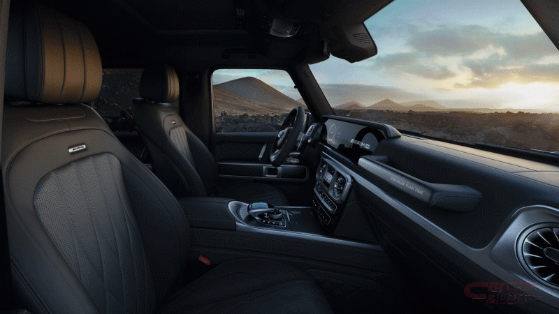 インテリアでは、特別仕様車専用のチタニウムグレーとブラックのナッパレザーを採用し、助手席には“STRONGER THAN TIME”ロゴ入りのナッパレザーグラブハンドルを採用しているほか、暑い時期のシートと接する部分の蒸れを防ぐシートベンチレーター[前席]、リラクゼーション機能[前席]、ヒーター・プラス[前席]を備えた“AMGエクスクルーシブナッパレザーシート”や、通常オプション設定の“AMGエクスクルーシブパッケージ”を装備。さらに、AMGカーボンインテリアトリムを標準装備している。