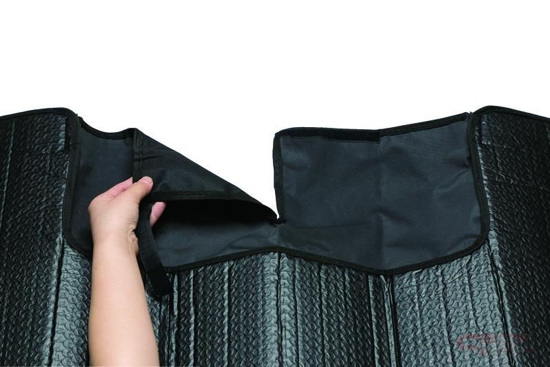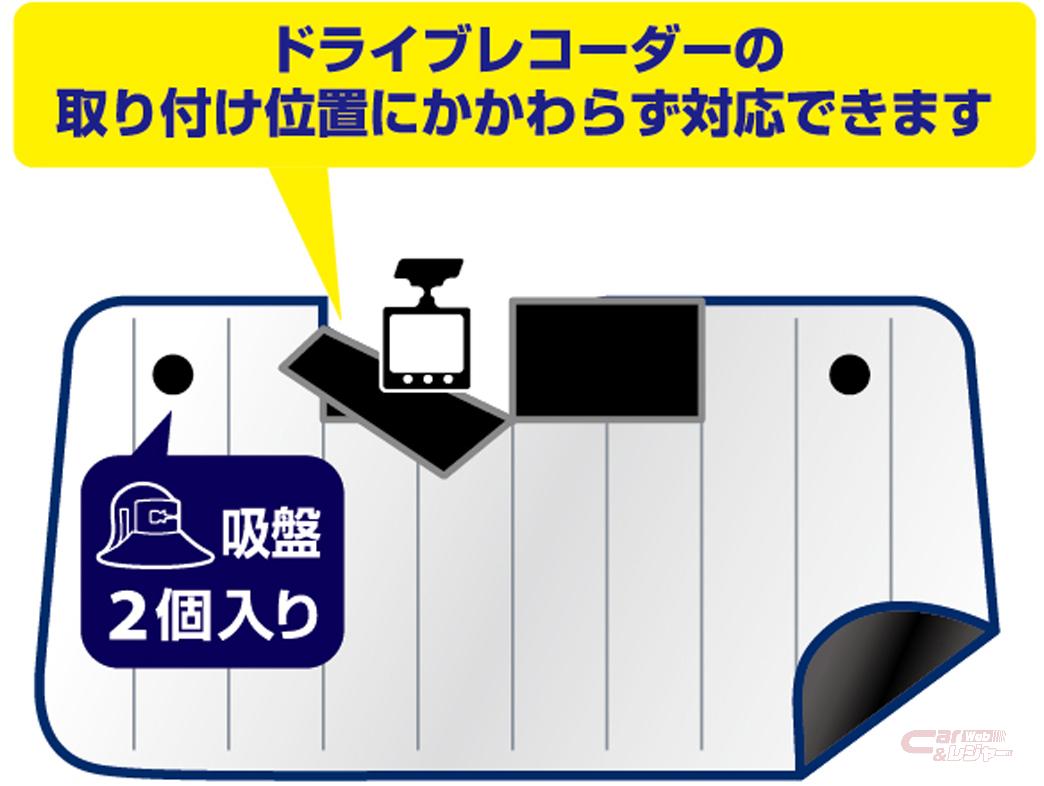 従来のサンシェードの場合、ドライブレコーダーを覆うような形で設置することになり、ドライブレコーダーがフロントガラスとサンシェードに挟まれ、高温になってしまい壊れるリスクがあったが、この新商品は上部の切り込み部分を幅広く設け切り込みを3か所作ることにより、取り付け位置にかかわらずドライブレコーダーをよけて設置でき、ドライブレコーダー本体が熱を持ち高温になることを防ぐことも期待される。