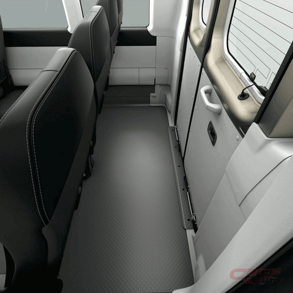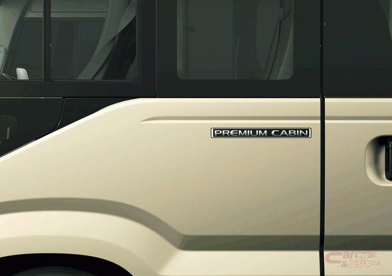 内装においては、「PREMIUM CABIN」専用装備として、スエード調で上質素材のブランノーブ®と合成皮革を組み合わせたブラックのシート表皮を背もたれと座面に採用し、サイドトリムにはシートと同色のファブリック素材を取り入れたほか、フロアの通路と足元にカーペットを敷き詰め上質な内装とした。また、外装にはセンタードアの横に、「PREMIUM CABIN」専用のステッカー(ボディカラーがホワイトの場合、ステッカーは車内に搭載)を採用し、ほかにも便利装備として、充電用USB端子を右窓側座席に設定している。