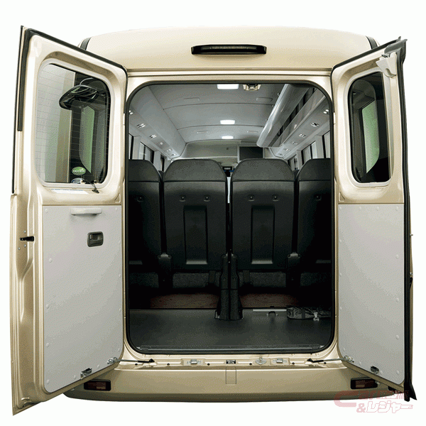 「PREMIUM CABIN」は、“快適でゆとりのあるシートレイアウト”と“広いラゲージスペース”にこだわった「コースター」の最上級グレードで、ゆとりのある座席スペースを実現するため、シートは通常よりも少ない5列シートを採用し、座席の前後間隔を約1m確保しているほか、車両後方にラゲージスペースと観音扉式バックドアを設置している。